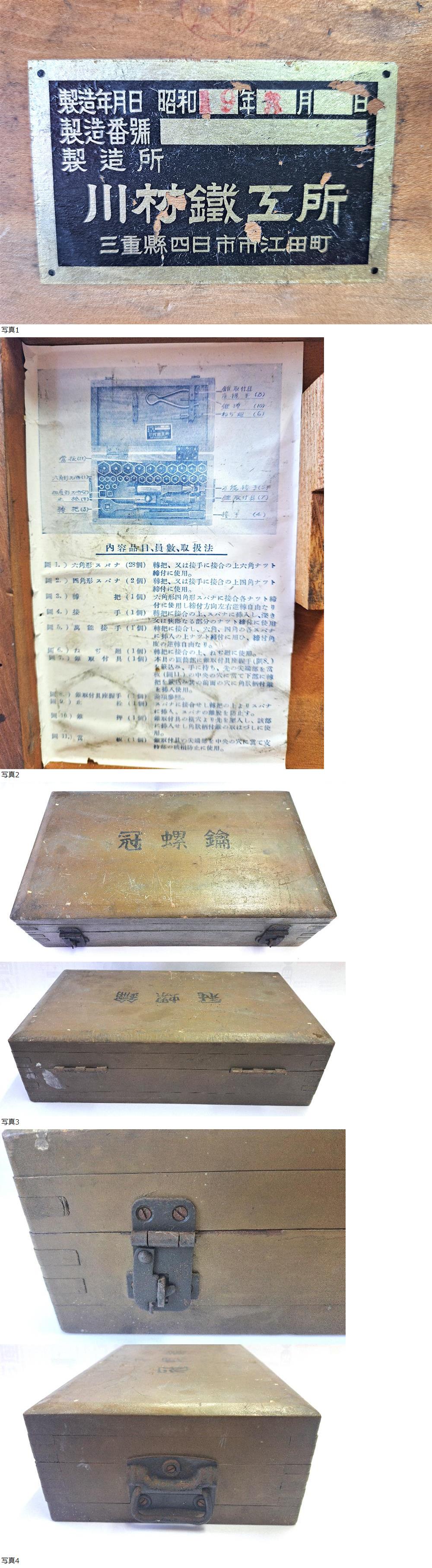 48時間以内に入金できない方、評価の悪い方、新規の方、連絡の遅い方、神経質な方、振り子機械式時計に不慣れな方の入札はご遠慮願います。 数年前に地元の骨董店で購入した冠螺鑰(スパナ、レンチ)デッドストック未使用工具です。店主の話では海軍の工場に努めていた方が閉鎖後持ち帰って保管していたらしいです。螺鑰(らやく)」は、フランス語の「Clef crous」に由来する、主に技術的・軍事的な文脈で使われた古い用語で、日本語では「スパナ」や「レンチ」を指します。ネジ(螺)を回す鍵(鑰)という意味らしいです。特に明治・大正から昭和初期にかけて、機械や砲兵の整備用工具として使用されていたようです。状態は画像の通りケースに傷みはありますが中身は使われた形跡はなく大変綺麗です。ラチェットもスムーズに動き実用にも問題ないかと思われます。詳しくは画像をよくご覧ください。 昭和19年、戦中の大変レアな未使用工具ですので軍マニアの方や古い車、バイク好きな方ガレージのインテリアや実用に如何でしょうか?寸法36×21cm 送料は佐川元払い・・・・・・・・・・・・ 【北海道】2,000円 【北東北】1400円 (青森、岩手、秋田) 【南東北】1400円(山形、宮城、福島) 【関東】 1400円 (茨城、栃木、群馬、埼玉、千葉、東京、神奈川、山梨) 【信越】 1600円(新潟、長野) 【北陸】 1600円(富山、石川、福井) 【中部】 1600円 (静岡、愛知、岐阜、三重) 【近畿】 1800円(滋賀、京都、大阪、兵庫、奈良、和歌山) 【中国】 2000円 (鳥取、岡山、島根、広島、山口) 【四国】 2200円(香川、徳島、愛媛、高知) 【九州】 2200円(福岡、佐賀、長崎、熊本、大分、宮崎、鹿児島) 【離島、沖縄】ゆうパック着払いのみ| 出价者 | 信用 | 价格 | 时间 |