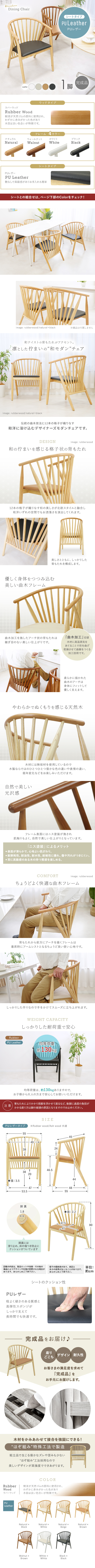 ●「フレーム(シート)」のお好きなカラーをご購入手続きの際【ご要望欄】へご記載ください。 【在庫状況】※完売となったカラーはご購入できませんのでご了承ください。 ナチュラル(ブラック)--------------販売中。 ナチュラル(ホワイト)--------------販売中。 ナチュラル(ベージュ)--------------販売中。 ナチュラル(ブラウン)--------------販売中。 ウォールナット(ブラウン)---------販売中。 ホワイト(ホワイト)----------------販売中。 ブラック(ブラック)----------------販売中。 ![]() ■和テイストの背もたれがアクセントの“和モダン”チェアです。 ■美しい12本の格子が和洋いずれの空間にもお洒落さを演出してくれます。 ■曲木加工を施したアーチ状のフレームは、身体にフィットして優しく支えます。 ■天然木を使用しているので、ひとつひとつ異なる木目や、経年変化による色の違いなど、木製ならではのぬくもりを感じられます。 ■ニス塗装が施されているので、美しい光沢で肌触りも心地よく滑らかです。 ■背もたれからアーチを描いたフレームは、アームレストとしてもちょうどよく快適です。 ■手をかけられるフレームは立ち上がり時にもしっかりしていて便利です。 ■均等荷重は約130kgとしっかりしているので、お子様から大人の方まで安心して使用できます。 ■木材をかみ合わせて強固に接合する“ほぞ組み”工法なので美しく高強度な仕上がりです。 ■脚裏には、床の傷つき防止のクッションがついていて安心です。 ■完成品なので、届いてすぐに使用できます。 ■重量: 【ラバー材】PUレザー/約6.7kg ■耐荷重: 【ラバー材】PUレザー/約130kg ■材質: 【ラバー材】 〈本体〉ラバーウッド[無垢材]〈脚裏〉PVC 〈張り地〉PUレザー/PU(ポリウレタン) ●新品商品ではありますが、輸入商品の為、多少の擦り傷などがある場合がございますので、ご納得の上ご購入下さいませ。 ●ご購入後、お客様ご都合によるご返品、ご返金等は一切お受け致しておりません。 ●本商品を使用した際に発生したトラブル、事故につきまして、当社は一切の責任を負いません。ご使用に関しましては、全て自己責任にてお願い致します。 |