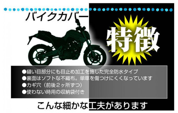 | 大切な愛車を雨で台無しにしてしまわないように、水滴も完全シャットアウトのバイクボディカバー「レインプロテクト」。縫い目部分にも目止め可能を施し、バイクを錆びや汚れから守ります。 大切な愛車を雨で台無しにしてしまわないように、水滴も完全シャットアウトのバイクボディカバー「レインプロテクト」。縫い目部分にも目止め可能を施し、バイクを錆びや汚れから守ります。 |