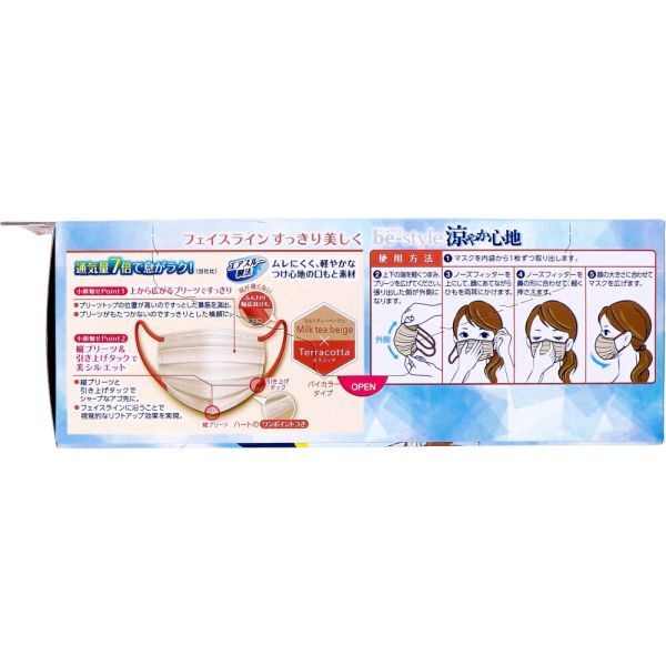 フェイスラインすっきり美しくうすくて軽い 通気量7倍で息がラク ※メーカー比 ムレにくく軽やかなつけ心地の口もと素材 花粉カット不織布フィルター ※マスクは感染(侵入)を完全に防ぐものではありません プリーツトップの位置が高いのですっとした鼻筋を演出しプリーツがもたつかないのですっきりとした横顔に 縦プリーツと引き上げタックでシャープなアゴ先に フェイスラインに沿うことで視覚的なリフトアップ効果を実現 バイカラータイプのミルクティーベージュxテラコッタ 【商品詳細】 マスクサイズ:90mmX165mm 個装サイズ:110mmX208mmX70mm 個装重量:約94g 内容量:20枚入 【素材】 本体・フィルタ部:ポリプロピレン、ポリエチレン、ポリエステル ノーズフィッター:ポリエチレン 耳ひも部:ナイロン、ポリウレタン 製造国:中国 発売元:白元アース株式会社 JANコード:4902407582539 |