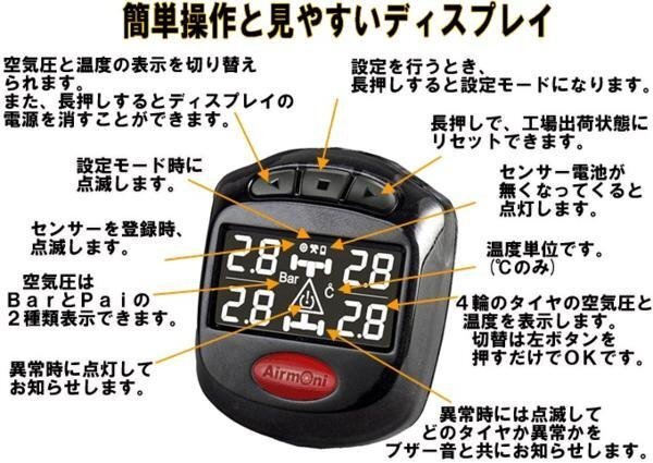 ★レシーバー(モニター)コンパクトでも簡単操作で見やすいディスプレイで、空気圧の表示は、0~3.4Bar又は0~50Psiの選択が可能です。