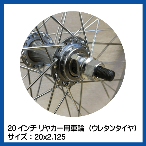 | 商品説明 | リヤカー車輪ノーパンク(ウレタンタイヤ)新品1本での出品です。 アルミ製の折り畳みリヤカーに使用されているサイズとなります。 取付けに関しては下記数値から判断をお願いします。 タイヤサイズ : 20x2.125 タイヤ仕様 : ノーパンクタイヤ(ウレタンタイヤ) タイヤ外径 : 約484.2mm タイヤ幅 : 約46mm ホイールボス巾 : 約93.6mm ホイールシャフト巾 : 8φ |