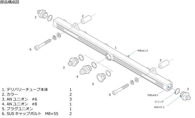 | 仕様 | キット構成: フューエルデリバリーチューブ ユニオン(AN6×3・AN8×1・プラグユニオン×1) デリバリーチューブ本体(ブラックまたはブルーアルマイト) チューブ内径 18.5φ ユニオン(ゴールドアルマイト) デリバリーチューブ取付側ネジ径 M20 |
