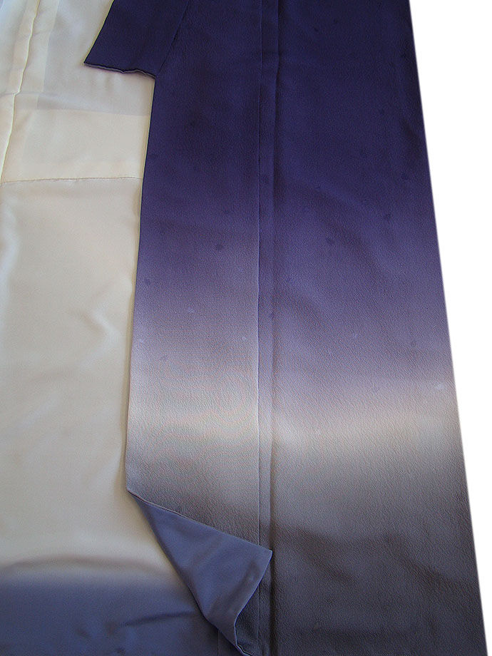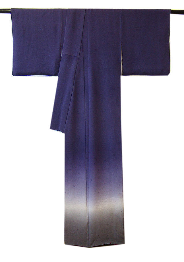 濃い江戸紫色地に裾グレー、霞色ぼかしに飛び柄のはなびら柄。