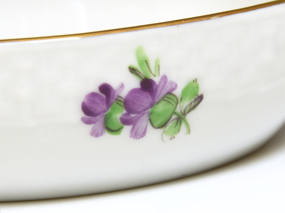 ハンガリーの名窯ヘレンドで製作されたハンドル付きのリングトレイです。 色鮮やかなフラワーブーケが繊細にハンドペイントされています。 シックなインテリア空間に上質で華やかな雰囲気をプラスしてくれます。 底部にはヘレンドのスタンプが刻印。 わずかなスレが見られますが、総じてコンディションは良好です。 ※撮影の際に生じた写り込みなどがございます。 ご理解の程よろしくお願い致します。 |
