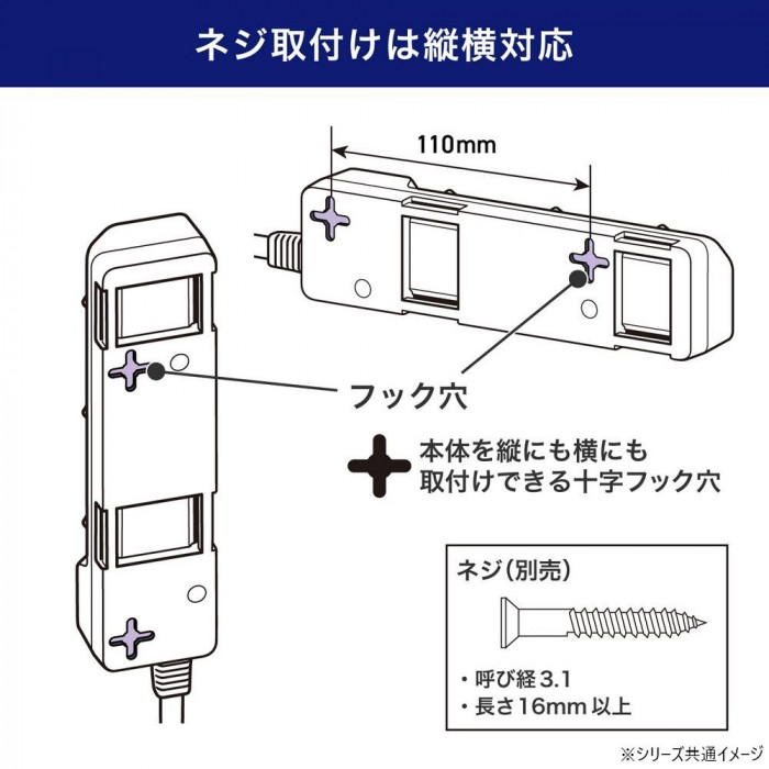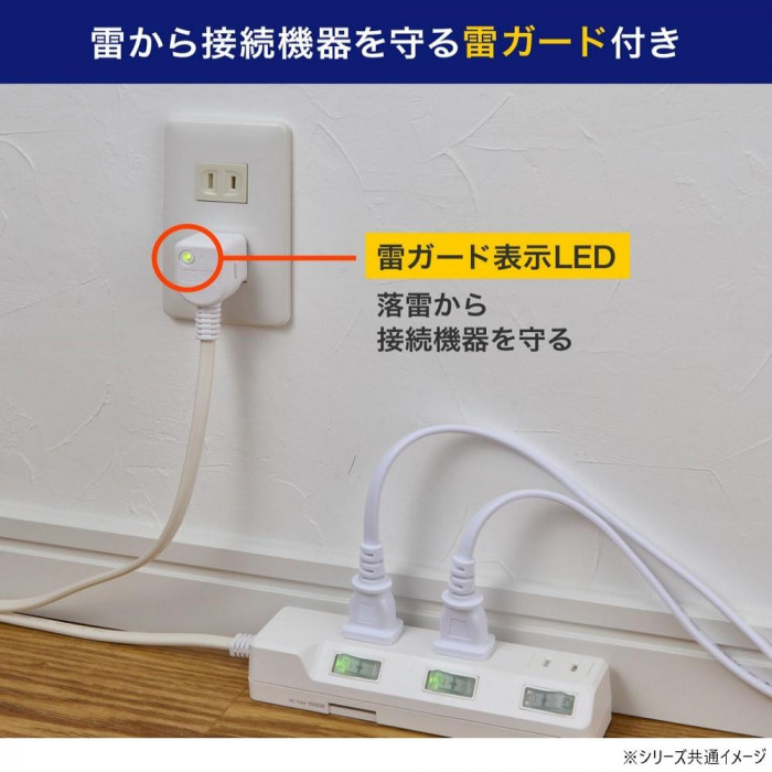 | LEDランプ仕様。独立スイッチ。雷から接続機器を守る耐雷サージ付。プラグに雷ガード表示LED付。AC差込口はホコリ・ゴミの侵入を防ぐ扉付。熱や衝撃に強いPBT樹脂採用。コードは、断線に強い保護被ふく。ACアダプター用差込口。本体の向きによって、差込口向きが選べる。 |