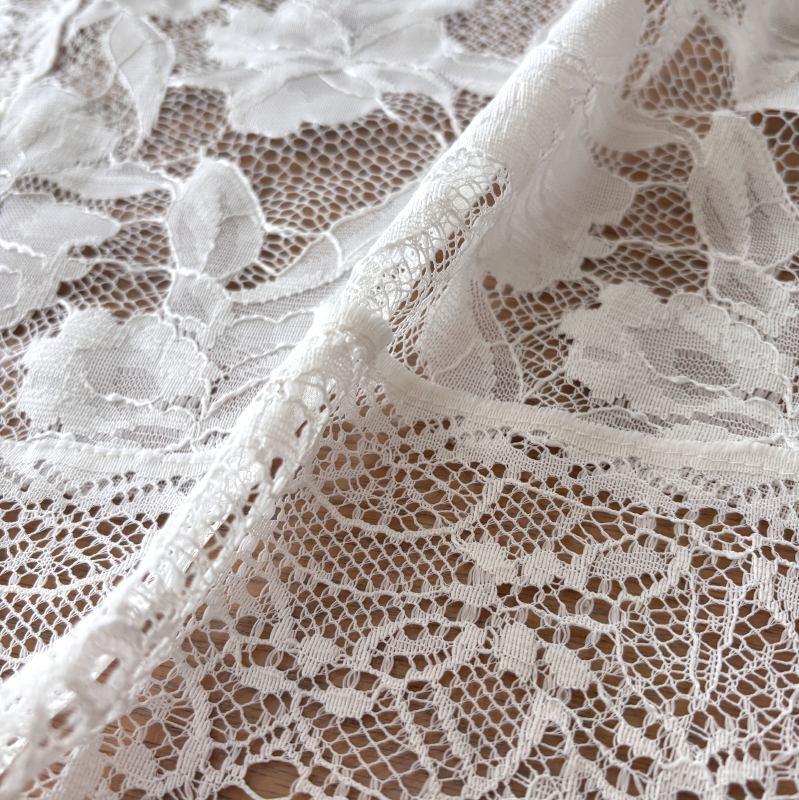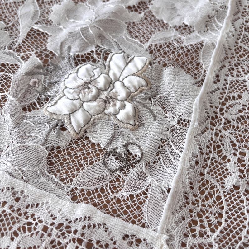 繊細な白いレースに花の刺繍があしらわれた優雅なデザインで、サイズは約47×75cm。