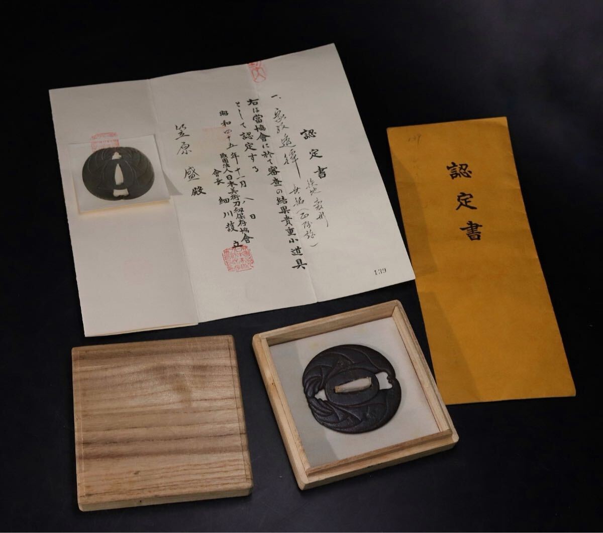 | 時代 刀鍔 「 家紋透 鉄地 無銘 ( 正阿弥 )」貴重小道具 認定書 付 日本美術刀鍔保存協会 / 刀装具 鉄 彫金 鍔 .B435 |