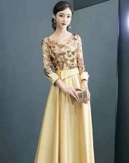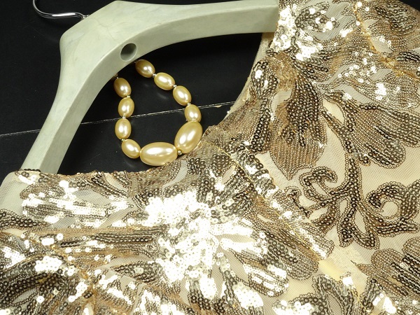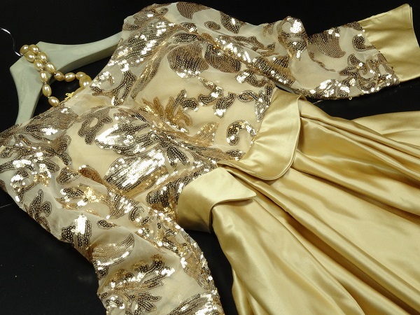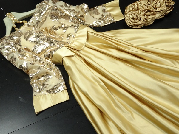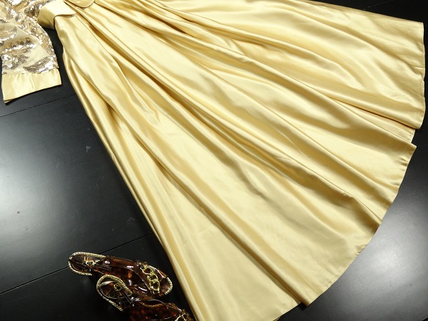ゴールドスパンコ-ルイブニングロングドレスです。気品に満ちたとてもエレガントで上品なひとクラス上をいく一品です。