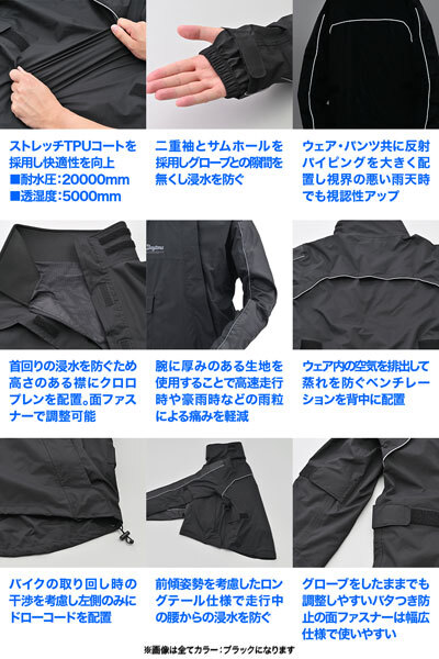 | ●ライダーが濡れないことを最優先に考えた、バイク用 防水・透湿 高性能レインウェア ジャケットは、動きやすいストレッチ生地を使用し、斜めに配置したフロントフラップがファスナーからの浸水を防止。首元には内側がクロロプレン素材の高い襟を採用し、袖口は二重袖とサムホール、裾は二重裾とドローコードで雨滴の侵入を防ぎます。背中のベンチレーションがムレを防ぎ、バタツキを防ぐ幅広の面ファスナーはグローブでも使いやすい設計です。パンツは、摩耗に強いPVCコート生地を使用し、裾はロングブーツでも履きやすい幅広の面ファスナー仕様。熱に強い綿生地のマフラーガードも装備しています。腕とひざには厚手の生地を使うことで雨滴による痛みを軽減。雨天時の視認性を高める反射パイピングも装備しました。収納袋は完全防水仕様で、小物バッグとしても利用可能です。 ■ジャケット [ 動きやすいストレッチ生地 ] 快適性向上のためストレッチTPUコート生地を採用。耐水圧20,000mm、透湿度5,000mm。 [ 斜めファスナーフラップで浸水を防ぐ ] ファスナーフラップを斜めにしたことで雨滴が流れ落ち、ファスナーからの浸水を防ぐ。 [ 腹部からの浸水を防ぐ ] 雨滴の溜まる腹部からファスナーをずらすことで、ファスナーからの浸水を防ぐ。 ■パンツ [ PVCをコートした高耐久性生地 ] シートとの摩耗が激しい下半身はPVCコートの高耐久性生地を採用。耐水圧20,000mm ■仕様 ・カラー:イエロー ・サイズ:L(身長170~180 / バスト92~100 / ウエスト79~94 / 股下85(cm)) ・ジャケット:素材 - ポリエステル100%、TPUコート(裏地)/ 初期耐水圧 - 20000mm JIS L1092 B法 / 初期透湿度 - 5000mm JIS L1099 B-1法 ・パンツ:素材 - ポリエステル100%、PVCコート(裏地)/ 耐水圧 - 20000mm JIS L1092 B法 ※身長は目安であり、体型によりあてはまらない場合があります。 ※バスト、ウエストはデイトナ社独自の計測方法に基づく寸法となります。 ※バスト、ウエストは商品の下に着るウエアの上から計測ください。 ※実際の商品は個体差が生じる場合があります。 ※サイズ交換は承れません。ご注文前に必ずサイズをご確認下さい。 ※取り寄せ品 |