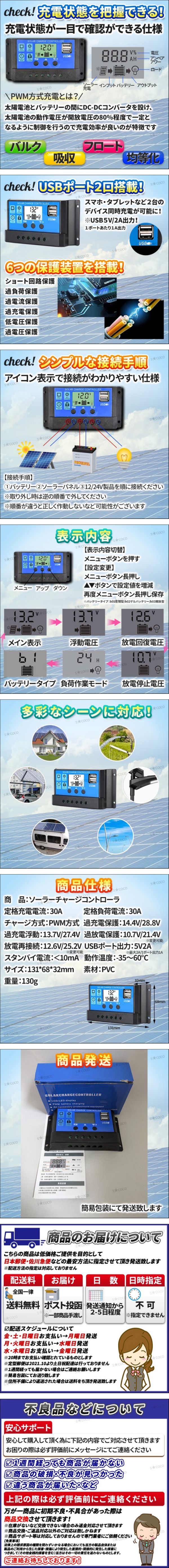 | ソーラー チャージ コントローラー 30A ソーラーチャージコントローラー チャージャー 12V 24V PWM バッテリー LCD液晶 太陽光 充電 | ||