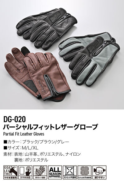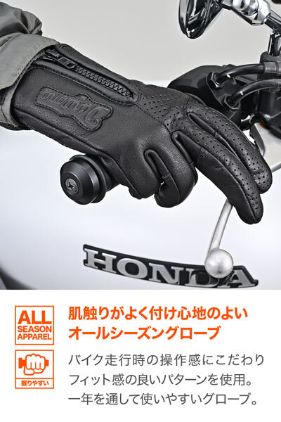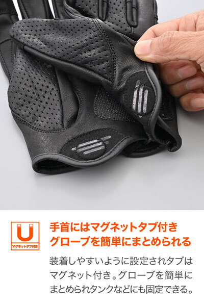 | ●好評なDG-011のデザインを踏襲したレザーグローブ。中央のファスナー開閉で面ファスナー嫌いな方にも。マグネットでタンクに貼り付けることが可能なマグキャッチシステム搭載。手の平には耐摩耗性が高いSchoeller(R)のKeprotecを使用。ライディング専用パターンを採用することで、操作性が高いレザーグローブです。 ■仕様 ・カラー:ブラック ・サイズ:XL ・素材:やぎ革 / ポリエステル / ナイロン ・対応シーズン:春 / 夏 / 秋 / 冬 ※サイズ交換は承れません。ご注文前に必ずサイズをご確認下さい。 ※取り寄せ品。 |