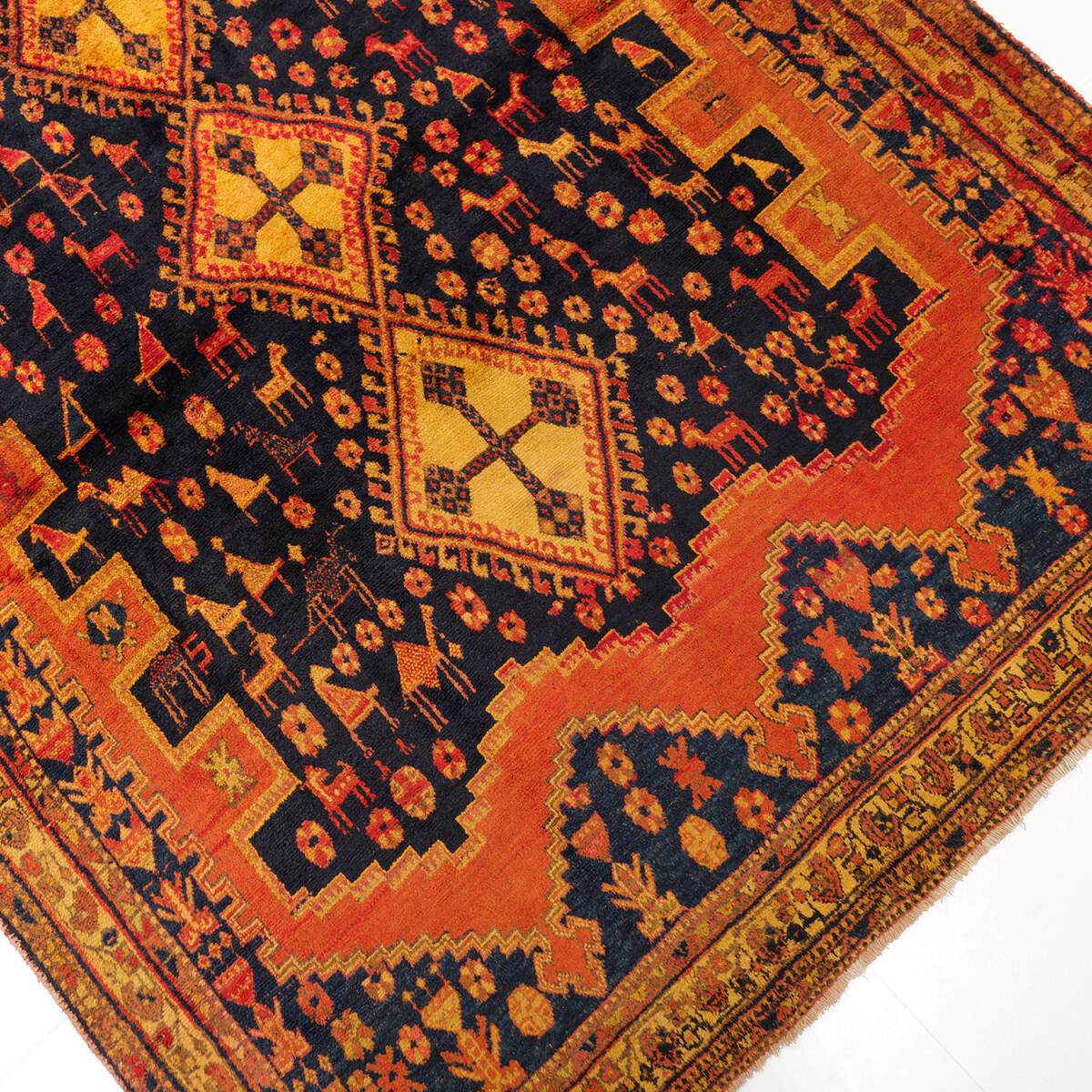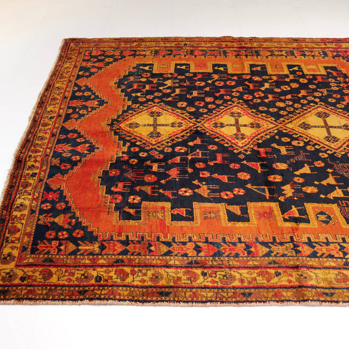 アフシャル特有の鮮やかな色彩と大胆な幾何学的パターンが融合し、空間にエネルギーと個性を与える一枚。ヴィンテージ家具やモダンインテリアとの相性も良く、リビングや広めの空間を引き立てます。