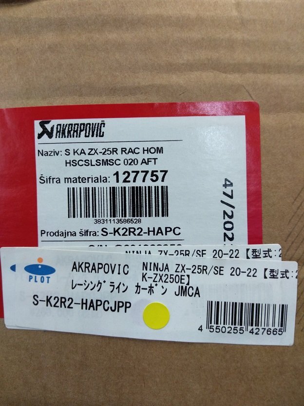 商品説明 日本国内の排出ガス規制や騒音規制 に対応したJMCA認証マフラーです。 商品名:レーシングライン カーボン 部品番号:S-K2R2-HAPCJPP メーカー新品希望小売価格 ¥410300-(10%税込み) アクラポビッチの『高性能・高品質・高音質』のマフラーを日本国内において、 ツーリングや住宅街でも「安心・安全・快適」にご使用いただけます。 タイプ:フルエキゾースト 【材質】 サイレンサー:カーボン エンドキャップ:カーボン エキパイ:ステンレス 加工:無 集合方式:4-2-1 規制:JMCA対応 型式:JMCA認証型式:2BK-ZX250E エンジン型式:原動機の型式:ZX250EE 自動車排出ガス試験結果証明書(排ガス証明書):有り(商品に付属します) STD重量:8.9kg 重量:6.5kg 【ご注意】 未使用新品ですが海外生産品です。 外装パッケージの傷みと使用上美観を損ねない程度の小傷はご容赦ください。 ※大きい傷は初期不良にてご対応致します。 適合車種 NINJA ZX-25R/SE (20'~22') こちらに記載の適合は、商品販売時点におけるメーカー公表年式となります。 これ以外の年式車両にお取付けする場合は、ご自身の判断でお願い致します。 数量限定特価です。 この機会に是非ご検討ください! | |||||