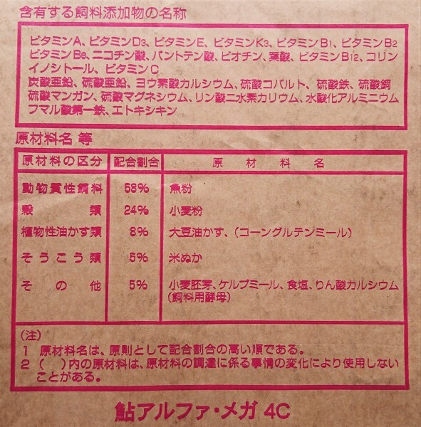 | ★商品説明★ | あゆアルファメガ4C(1~1.6mm)100gの出品です。 鮎養殖用で愛用者の多い水産飼料(弱沈下性)で、古くから金魚養殖場で使用されている、フィード・ワン(旧日本配合飼料)のあゆの餌です。 魚粉・小麦粉・油粕などをバランスよく配合し、金魚に優れた効果が期待できます。 ブリーダーの方にも古くから利用されている比較的安価な万能飼料です。 当方でも使用していて、土佐錦の親魚に与えています。 土佐錦、らんちゅう、他の金魚、淡水魚に幅広く利用できます。 小分けしてチャック付きポリ袋(0.08mm)に入れて封筒に梱包し「クリックポス」にてお届けします。 他商品との同梱発送も可能です。 【成分量】 ・粗蛋白質 46.0% ・粗脂肪 3.0% ・粗繊維 2.5% ・粗灰分 15.0% ・カルシウム 2.0% ・りん 1.3% 【原材料】 ・魚粉、小麦粉、大豆油かす、コーングルテンミール、米ぬか、小麦胚芽、りん酸カルシウム、ケルプミール、食塩、飼料用酵母 【対象魚】 土佐錦・らんちゅう・ナンキン・ピンポンパール、オランダなどの金魚 錦鯉・コリドラス・プレコなど淡水魚全般 |