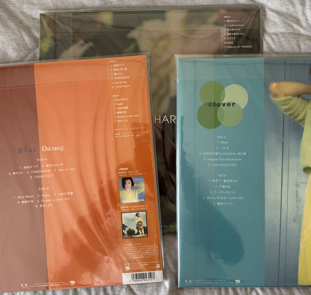 原田知世のclover、I could be free、Blue Orangeのカラーレコードになります。新品未開封の状態で保存用のビニール袋に入れて大事に保管してたのでジャケットの凹み日焼け等無く綺麗です。