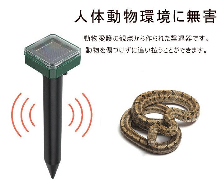 【人体動物環境に無害】動物愛護の観点から作られた撃退器です。動物を傷つけずに追い払うことができます。超音波センサーのため(害虫撃退、ネズミ?蛇?モグラなど害虫の神経システムに刺激?不安を感じさせ、撃退します少)し音が聞こえます。人と動物に無害ですが、室外に置いた方をおすすめいたします。
