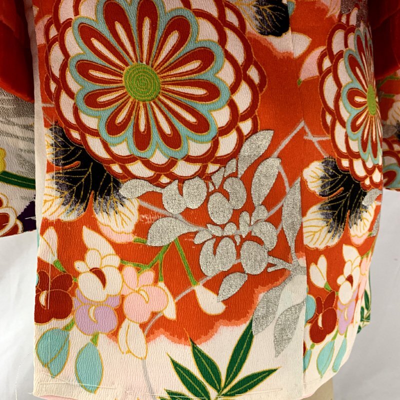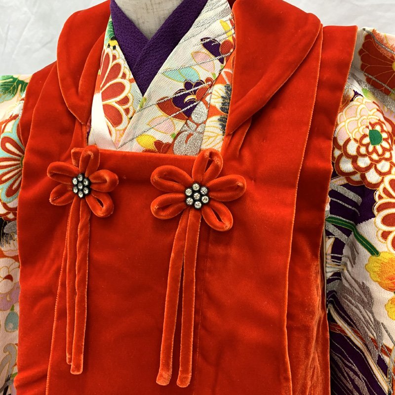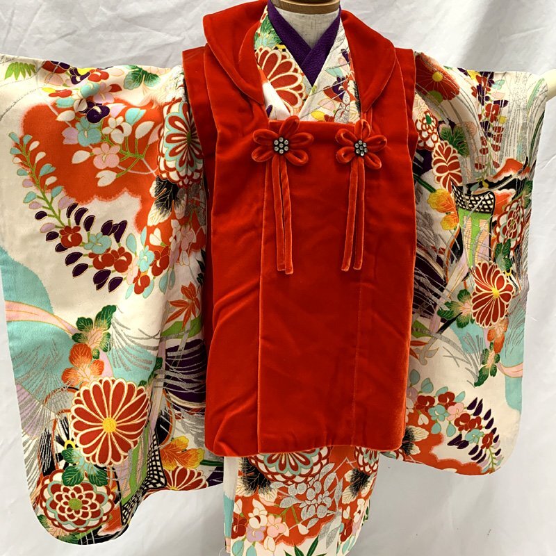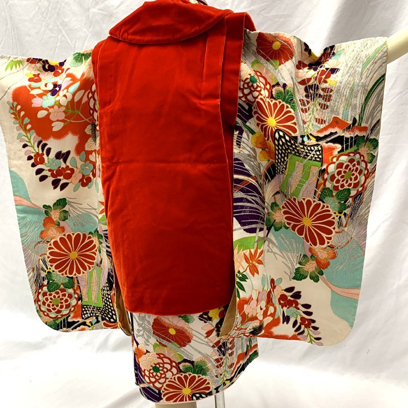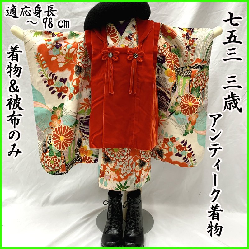 | □七五三 三歳 アンティーク 女児 着物&被布 銀彩 御所車 菊 白□状態良好 (No.ed) *こちらの商品は着物&被布のみです。(その他の半衿、付け衿、ヘッドピース、ベレー帽、ブーツはセットに含まれません。) 人気のアンティーク。白の地に、銀彩が施された御所車や菊文様などがレトロで可愛らしい七五三3歳のお着物セットです。 (着物)一つ身のお着物です。右外袖や右内袖の矢印部分に、シミ?のようなものがございますが柄に紛れてあまり目立ちません。袖の内側が経年の変色がございますが、着用時見えません。 (長襦袢)こちらには長襦袢が付属いたしません。代わりにお子様の負担が少なく便利な「子ども用楽々衿」をお勧めします。#ag楽々衿 (被布)特に目立つシミやダメージはございません。 【表地素材】(着物)正絹、(被布)アセテートパイルのベルベット生地 【色】白 *モニターによって色味は実際と異なる場合がございます。 【サイズ】(着物) 裄:36.5cm、肩上げ幅:3cm、袖幅:27cm、袖丈:56cm、丈(肩から):93cm、腰上げ幅:0cm、前幅:13.5cm、後幅:15cm (被布) 幅:32cm、丈(肩から):48cm *素人採寸のため、多少の誤差はご容赦ください。 七五三後は、お正月やお節句などにもいいですよ。お求め安い価格での出品ですので、いかがでしょうか? | |