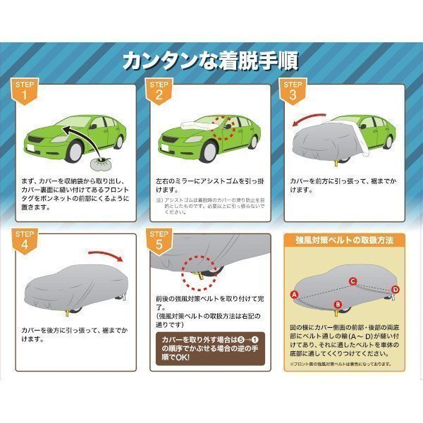 | 自動車用ボディーカバー(強風対策ベルト付) ※汎用品の為、車種によりドアミラー位置が合わない場合がございますので、ご了承ください。 |