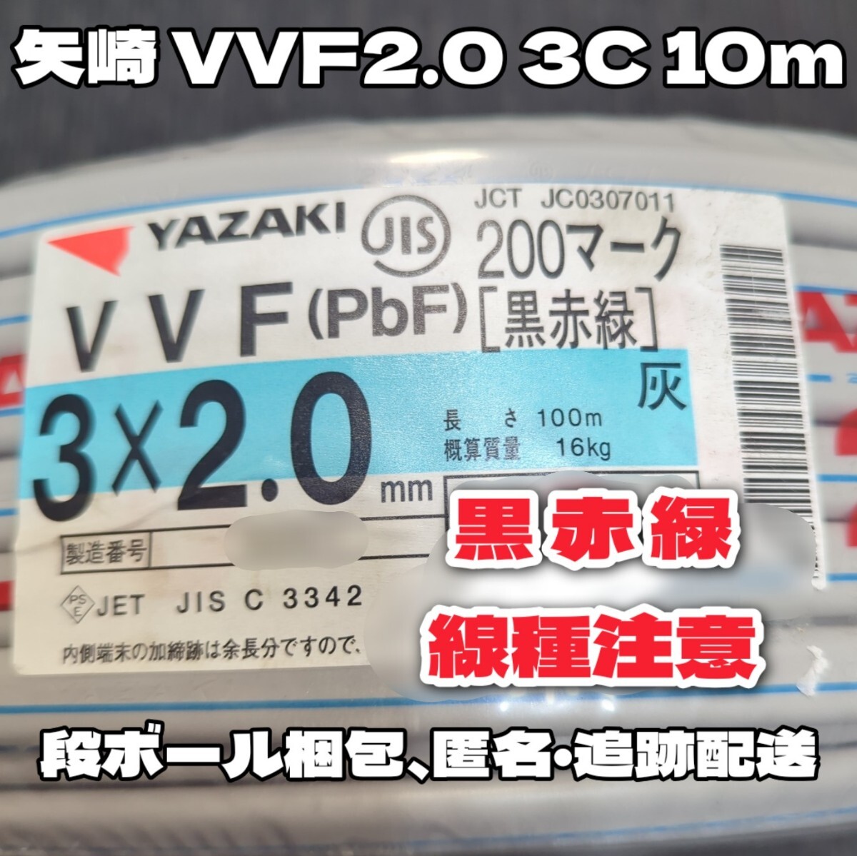 2024年製造の矢崎エナジーシステム製、VVF2.0 3C 約10mとなります。| 出价者 | 信用 | 价格 | 时间 |
