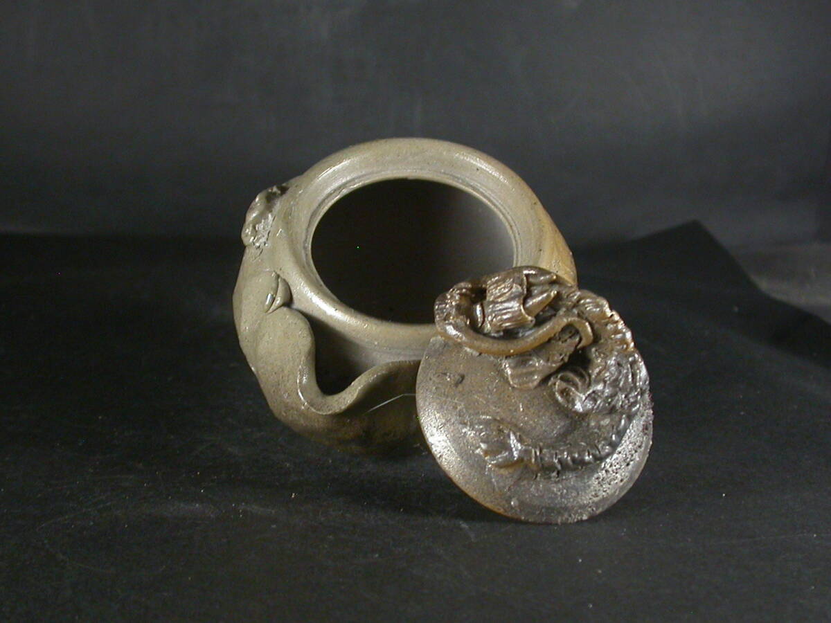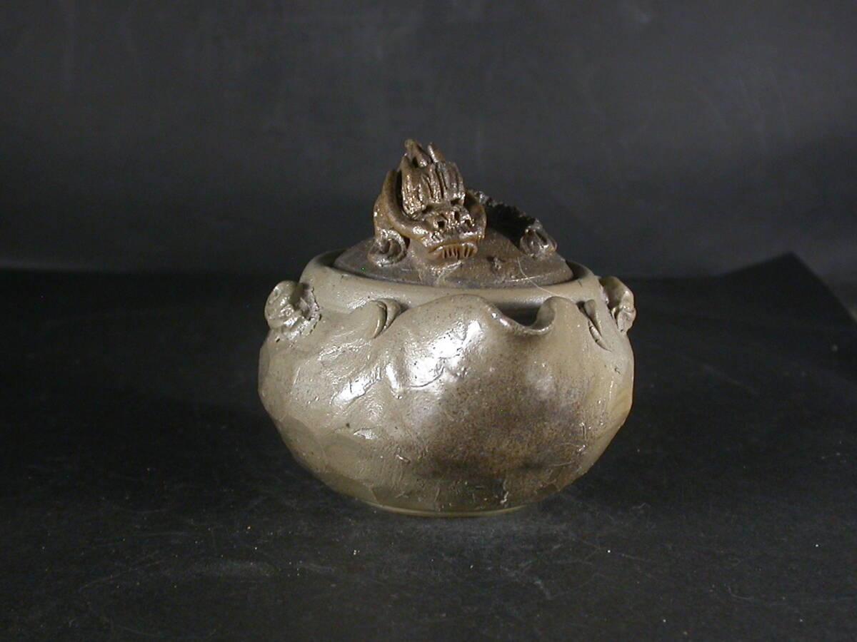 昭和26年岡山県生まれ。備前焼に惹かれ備前陶芸センター卒業後人間国宝山本陶秀・岡山県無形文化財山本雄一親子に師事。県展他入賞。陶秀の陶技・焼成を良く受け継ぎ陶秀譲りのろくろ技術と紐造り・面取等多彩な造形で人気があります。この宝瓶は今回窯出しの最新作で龍飾りで面を取った雰囲気のある作りに、焼けは還元で青く良く焼き締まった地肌に鮮やかな金彩と黄・焦げ茶のゴマが掛り良い雰囲気の作品となっています。高さ約8.5センチ、径約8.5センチ、口までの幅約10.5センチ。栞付き。