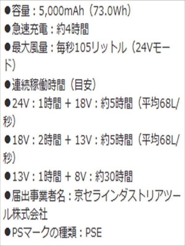 | 種 類 | 24V リチウムイオンバッテリー単品 空調服用 | ||