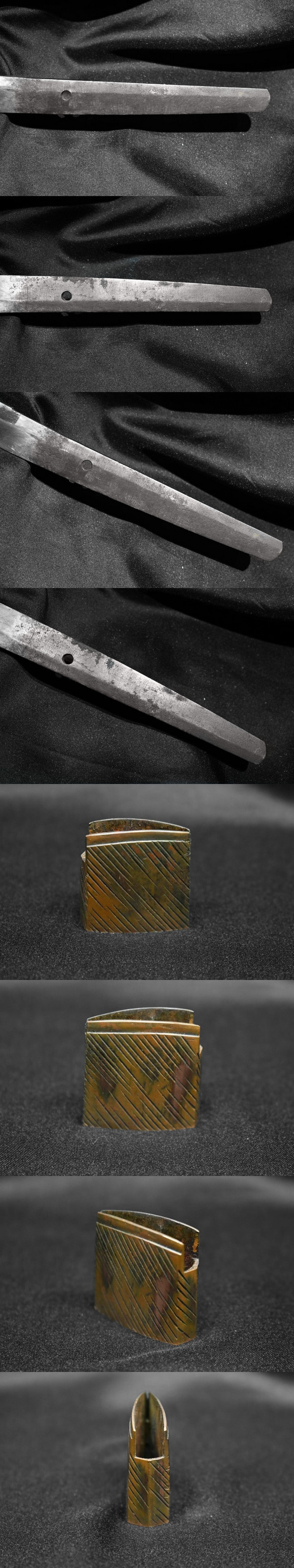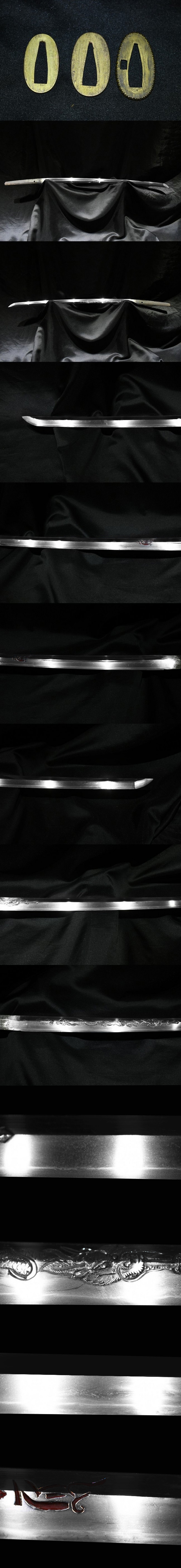 説明:古い蔵に長年保管されていた刀です。無銘ながら見事な鍛えを示し、刀身には迫力ある竜彫りと梵字が刻まれた大変見応えのある一振りで、古拵えが添えられた旧家蔵出し品です。 |