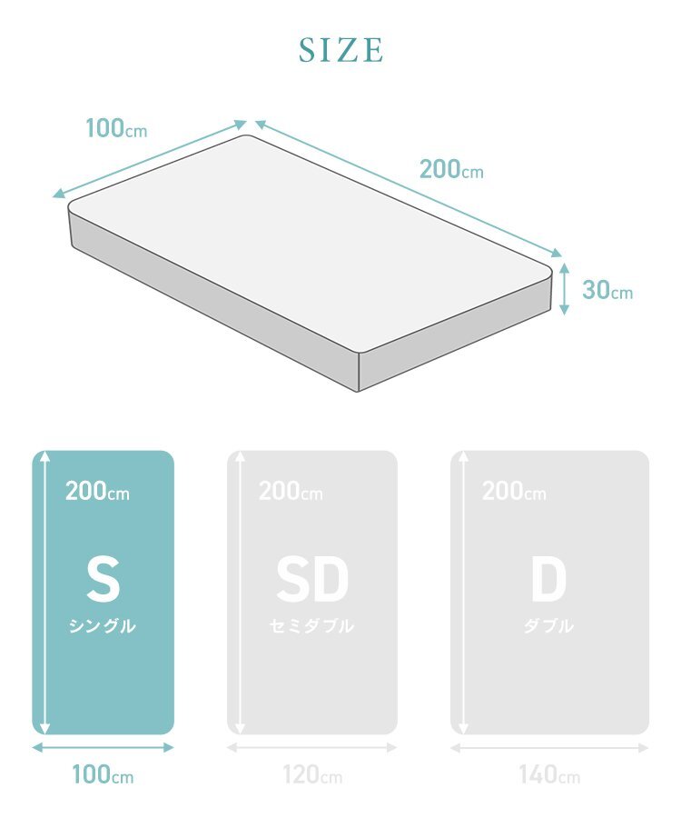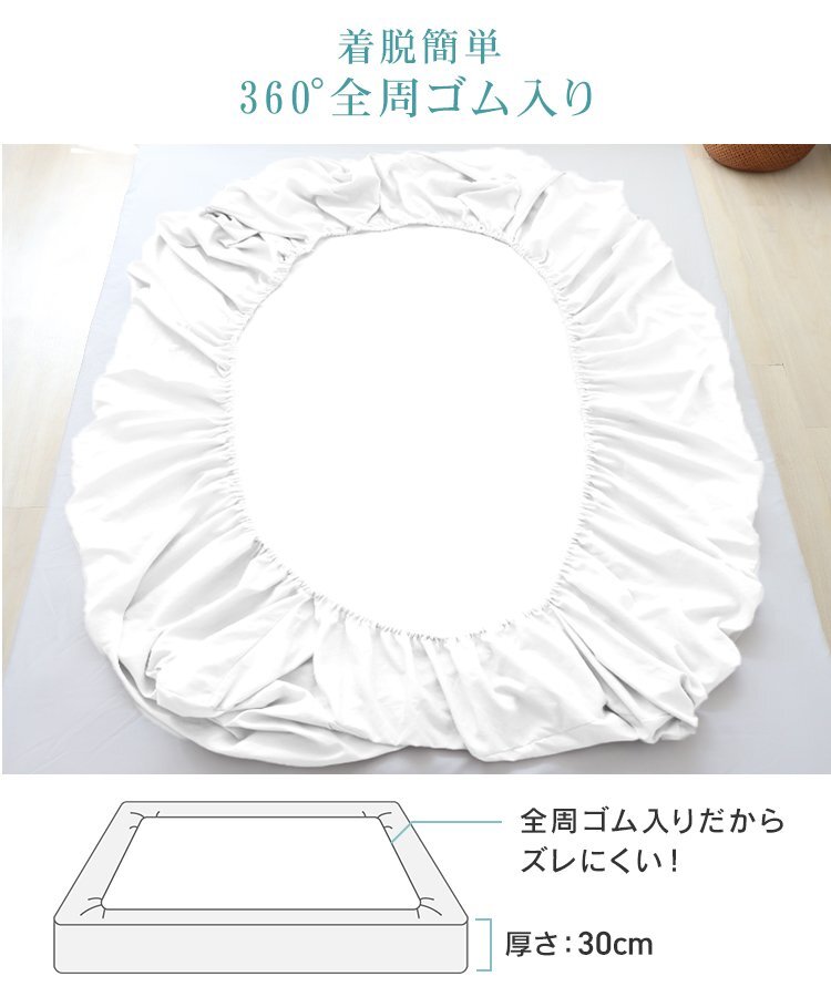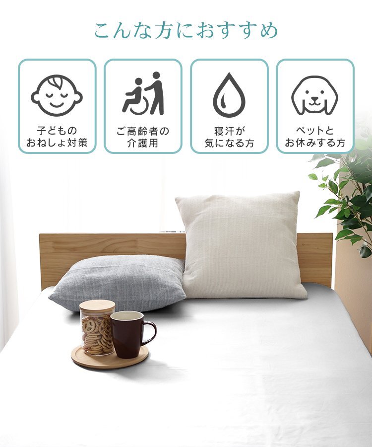 マットレスへの漏れの心配なし! 快適な眠りをサポート。 さらに防臭・抗菌・防ダニ加工を施し、いつでも清潔な状態をキープ! 汗や皮脂によるニオイの発生を抑え、 菌やダニの繁殖を防ぐので敏感肌の方やお子様にも安心してお使いいただけます。 28cm厚のマットレスまで対応で簡単に着脱できるので、 お手入れもラクラクです。 \ こんな方におすすめ / ・ 天然素材にこだわりたい方 ・ サラッと快適な寝心地を求める方 ・ 清潔&衛生的に使いたい方 【商品仕様】 カラー:ホワイト サイズ:横幅100cm×長さ200cm 厚み:(約)30cm 素材:表面:ポリエステル100%/裏面:TPU防水膜 【注意事項】 ・ボックスシーツのみの販売となります。マットレス本体は付属いたしません。 ・商品は、モニターによって色合いが異なって見える場合があります。 ・仕様・デザインは改良のため予告なく変更することがあります。 |