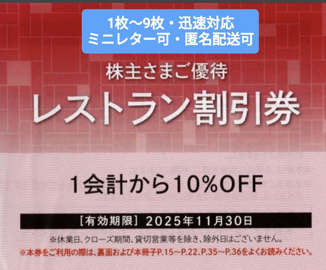 ★西武ホールディングス 株主優待 レストラン10%割引券 1枚~9枚★ プリンスホテル グランドプリンスホテル| 出价者 | 信用 | 价格 | 时间 |