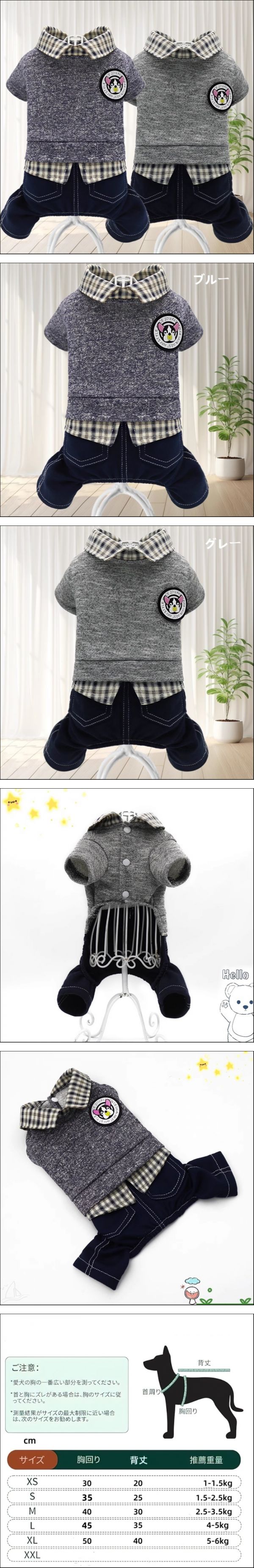 | 商品名 犬服 秋冬用 つなぎ チェック柄 シャツ風 デニム風パンツ付き 四脚タイプ 前開き ボタン式 保温 おしゃれ カジュアル ドッグウェア 商品コード:STdg312 カラー: ブルー、グレー サイズ: XS、S、M、L、XL、 ※ご購入の際は、取引ナビより必ず商品 カラー 、サイズ をご指定下さい。 商品について ※ 海外製品の為、若干の縫製の荒さ、糸くず等が見受けられます。検品は行っておりますが、稀に見逃して発送してしまう場合が御座います。商品に著しく影響を与えない場合は返品対象とはなりませんので、予めご了承願います。 ※ 運送や配送等で、表面に若干のスレや汚れ、キズがある場合がございますが、ご利用には支障がないかと思いますので、予めご了承お願いします。 ※ PC・環境・光の具合等により、色のイメージが画像と若干異なる場合が御座います。 ※ 平置き採寸となりますので、多少の誤差についてはご容赦下さい。 返品について ※ 不良品以外は交換、返品はできません。 犬服については衛生上の問題で、ワンちゃんに一度でも着せた洋服は返品、交換することができません。予めご了承ください。 | |||