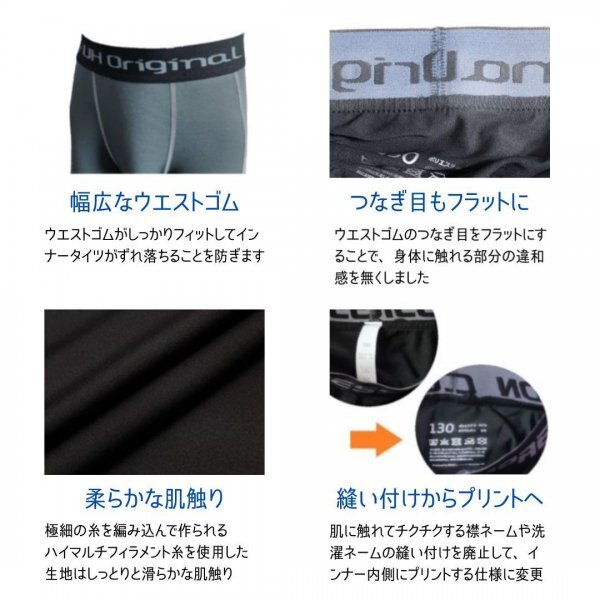 | お子様の肌に触れるその商品、本当に大丈夫? 着替えも恥ずかしくない! ぴったりフィットでもサラサラでインナーが気にならない! シンプルさを追求し、日本国内でデザイン・監修した完全オリジナルなUHブランドインナー。 コンプレッションインナーとしてお子様のスポーツやトレーニングに力を発揮!筋力をサポートしてパフォーマンスを上げ、 筋損傷の回復効果があることを確認した研究から、疲労回復効果もあります。ユーエイチブランドの製品は日本国内の品質評価機構にて生地検査合格を取得。紫外線防止指数の測定値はUPF50+、紫外線遮蔽率は99.8%でお子様の日焼け防止効果も抜群です。吸汗速乾なスポーツインナーは長時間のスポーツでも快適に過ごすことができます。ハイマルチフィラメント糸を使用した生地は柔らかな肌触りで、夏冬問わず全シーズンに対応! ウエストゴムがしっかりフィットしてインナータイツがずれ落ちることを防ぎます。4方向に伸びるストレッチ素材のため、着るのも脱ぐのもカンタンで、ピッタリフィットでも動きやすく、日常的に通学用や日焼け防止、防寒用レギンスとしても使えます。 ■組成表示■ ポリエステル92% ポリウレタン8% ■使用環境■ 野球、サッカー、フットボール、ラグビー、陸上、テニス、バスケットボール、バドミントン、バレーボール、卓球、ソフトボール、ジョギング、ランニング、トレーニング、スキー、スノーボード、ダンス、ヨガ、フィットネス、登山など、あらゆるスポーツに対応したコンプレッションインナーがお子様のパフォーマンスを向上させます。本体とステッチが同色のため、公式戦にも対応してます。 ※ご利用のパソコン、モニター環境によって、画像の色味が異なって見える場合がございます。予めご了承下さい。 | ||