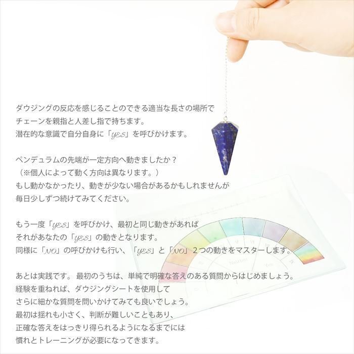 | 【STONE KITCHEN 天然石 パワーストーン】 ペンデュラムは潜在能力を引き出す サポートをしてくれるアイテムとして使われています! 日々の生活の中で、2つの事柄を選択する状況に立つことがあります。 どちらを選択するかその答えを引き出すために 力を貸してくれるのがペンデュラムです。 二者択一の質問を自分にしてみて下さい。 【サイズ】トップ:約35mm×約20mm 全長:約20cm 【素材】ローズクォーツ 1点 注意事項 ※こちらの商品は画像と同等クラスからランダムにご用意させて頂きます。 ※表示のサイズは必ずしも最大値・最小値のサイズのものが入っているわけではございません。 ※天然石のため同じものでも色味・模様などが異なります。 ※照明の具合で実際とは色合いが異なる場合がございます。 また、天然素材特有のクラック・内包物を有する場合がございます。予めご了承下さい。 | |||