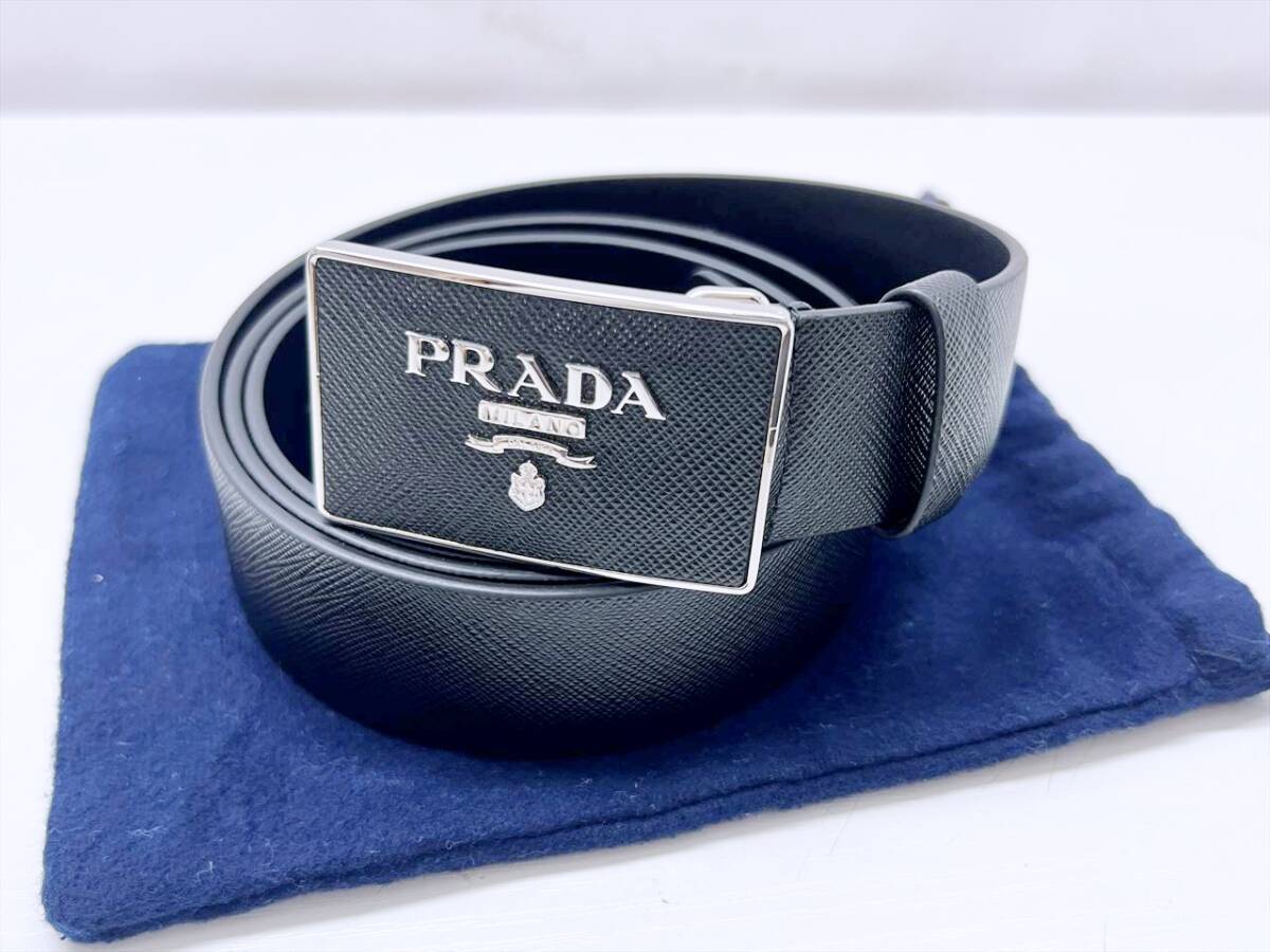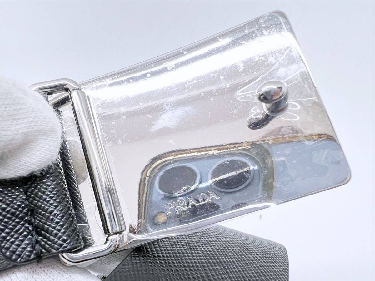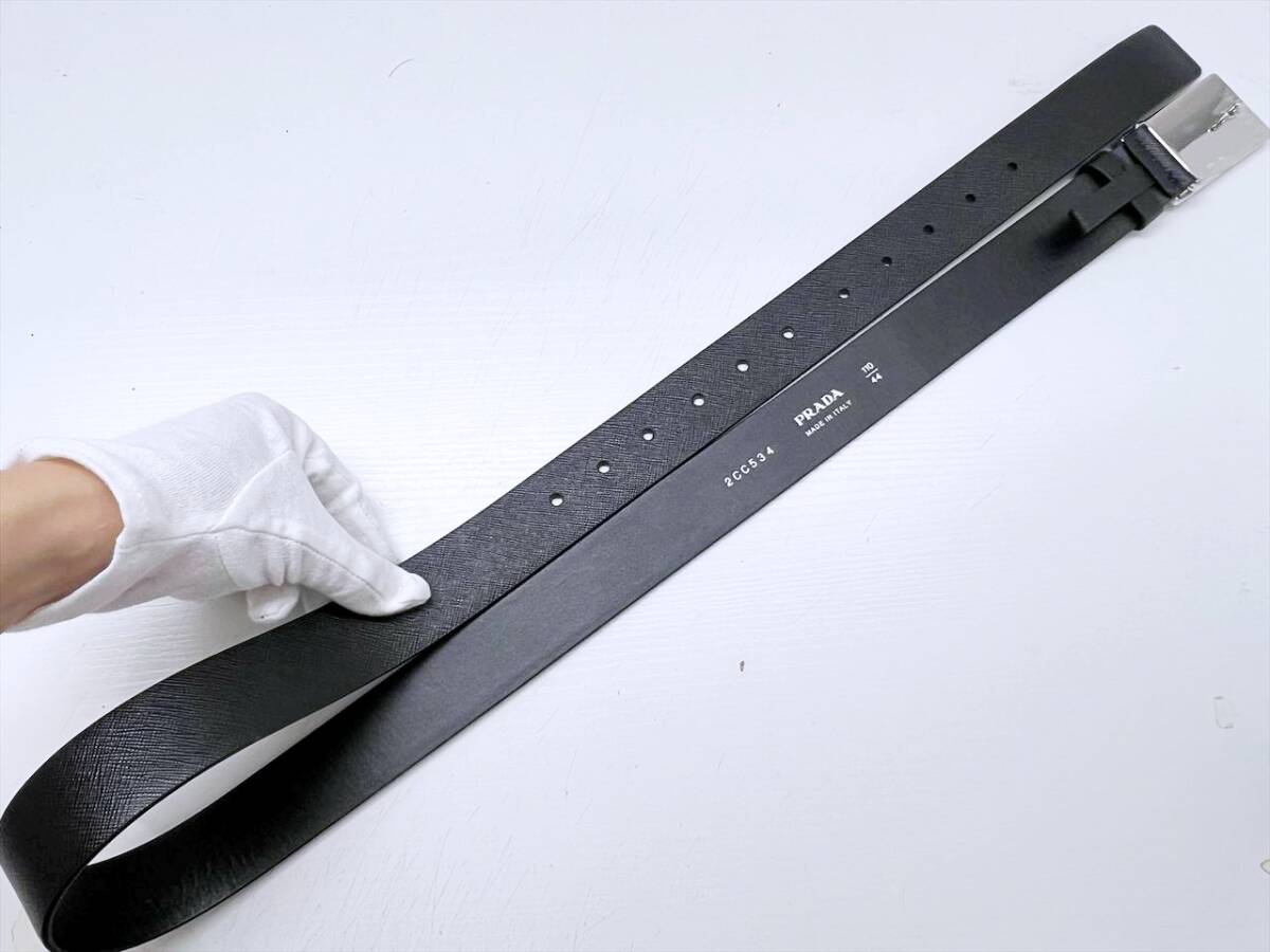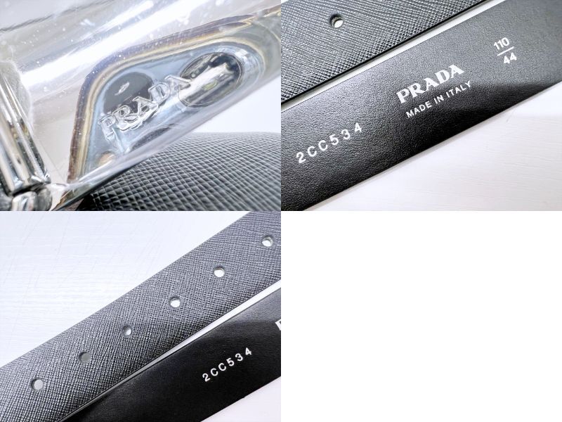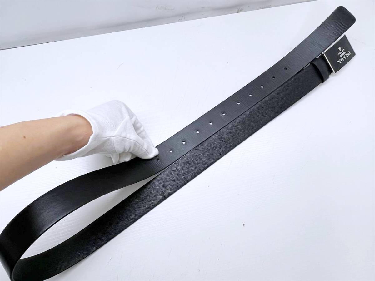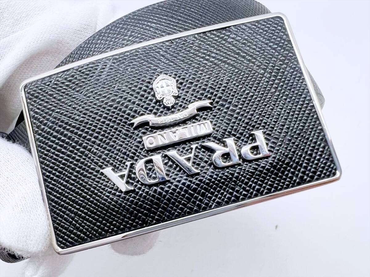 美品 25年現行 PRADA プラダ ロゴ スクエアバックル サフィアーノ レザー ベルト 110 黒 シルバー 2CC534