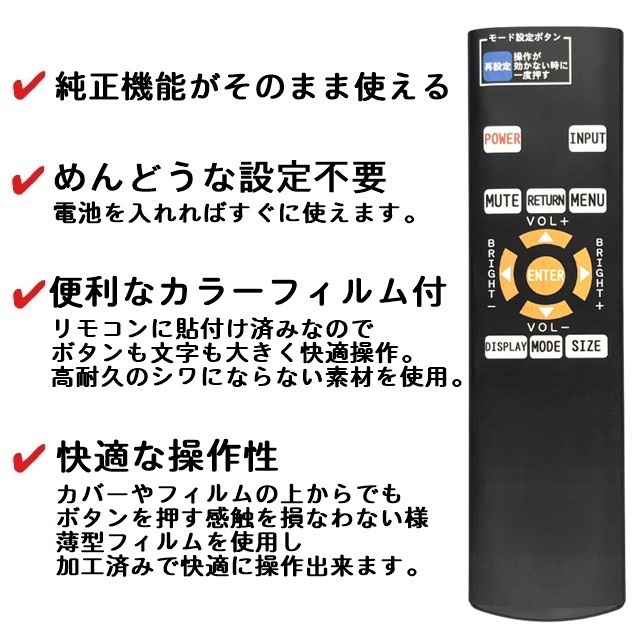 | 【商品名】 SHARP RRMCG1016MPPZ 代替リモコン 【対応機種】 PN-Y556 PN-Y496 PN-Y436 PN-Y326 PN-Y326A PN-Y555 PN-Y475 PN-Y425 PN-Y325 PN-W435 PN-H701 PN-H801 PN-E802 PN-E803 PN-E703 PN-E603 PN-A601 PN-U553 PN-U473 PN-U423 用 画像1枚目左側のリモコンが付属する機種に使用出来ます。 上記機種以外については、質問欄よりメーカーと型番をご連絡頂ければ、対応品のご案内をしております。 【商品について】 右側の代替リモコンが出品物になります。左側のリモコンは見本画像です。 タイトル機種のリモコン信号を入力した、設定不要で使える純正品と同等の代替リモコンです。 商品に不具合があった場合は代替品交換かご返金にて対応させて頂きます。 【付属品について】 防水リモコンカバーをお付けします。 ボタン機能を印刷した薄型フィルムはリモコンに貼付け済みです。 乾電池は付属しません。別途ご用意下さい。(単4乾電池×2本) 【発送について】送料無料 迅速発送を心掛けております。土日祝日はお時間を頂く場合ございます。 ポスト投函配達となり、日時指定は出来ません。 | ||