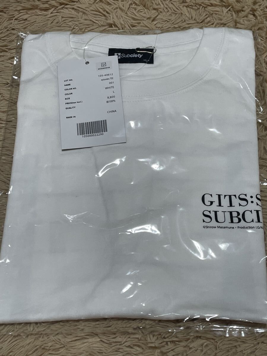 攻殻機動隊subcietyコラボTシャツ。未開封未使用品です。サイズはLです。色は白です。写真4枚目は、(黒のTシャツで載せてありますが出品の品は、白です。)背中のプリントになります。自宅保管になります、予めご了承下さい。発送方法は、ネコポスにて致します。ノークレーム、ノーリターンでお願い致します。