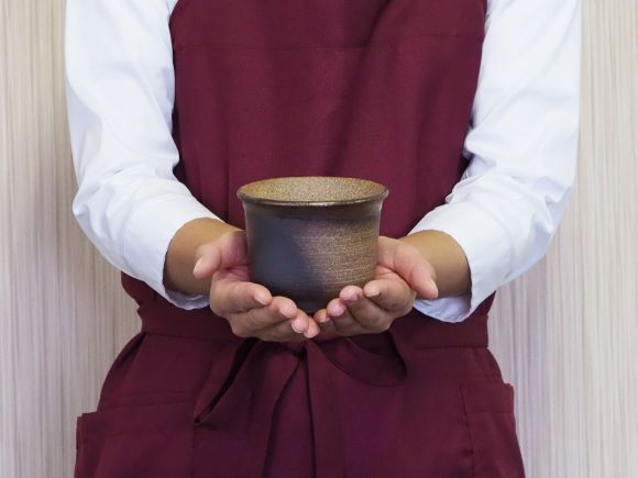 シンプルで自然体な鉢はすべての植物を受け止める懐の深さをもち、盆栽などを植える鉢としてもさまになる。盆栽を象徴的に魅せるため金彩や黒のラインがあしらわれています。