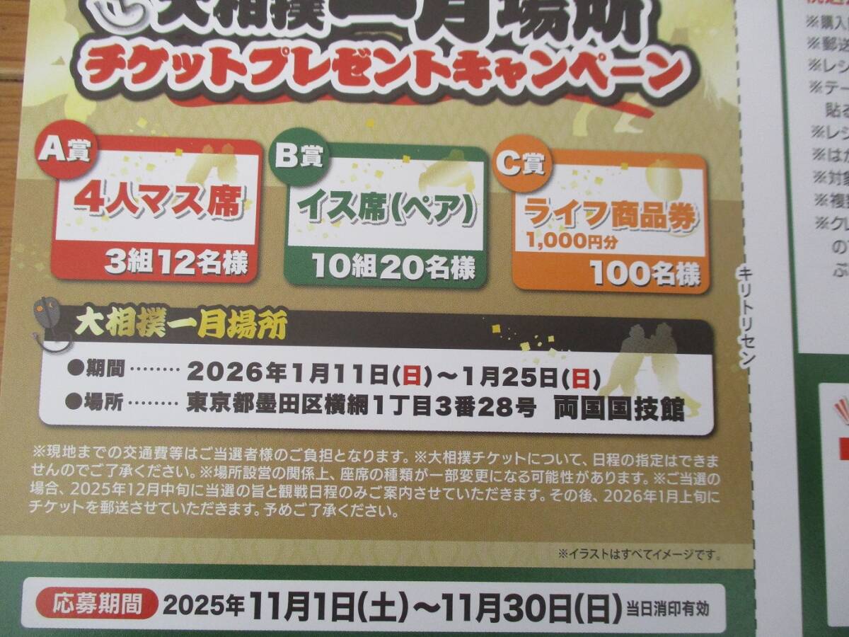 ライフ×永谷園共同企画 大相撲一月場所チケットプレゼントキャンペーンに応募出来る| 出价者 | 信用 | 价格 | 时间 |