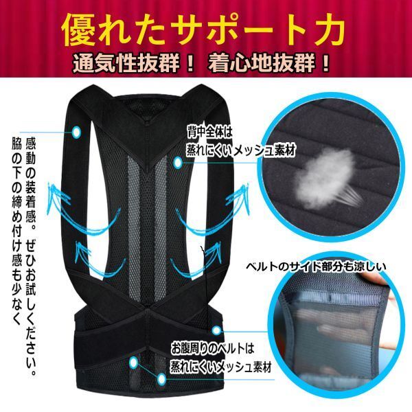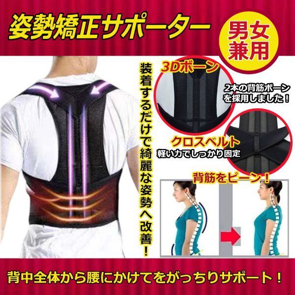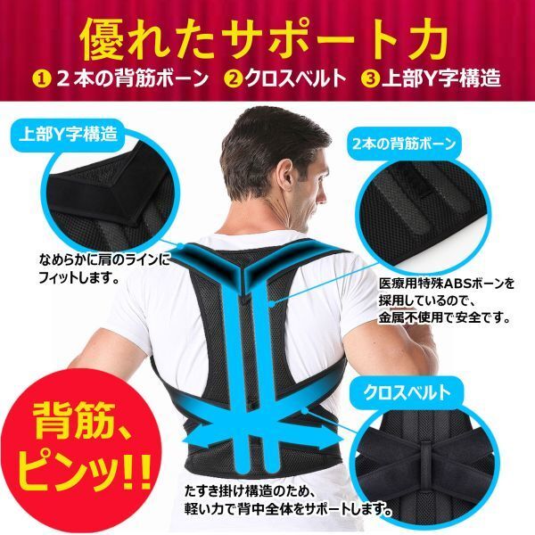 こんなお悩みはございませんか? スマホ利用などで巻き肩になっている。 気がつくと猫背姿勢になっている。 長時間同じ姿勢でいることがある。 首や肩こりがあり疲れやすい。 テレワークで腰や骨盤が痛い。 【美しい姿勢へ】 長時間のデスクワークやパソコン・スマホの使い過ぎで、身体の歪みが気になってる方へ。 そんな悩みを解消し美しい姿勢を保つために開発された姿勢矯正サポーター! 正しい姿勢を自然と意識することで、肩を開いて姿勢をサポートします。 【優れたサポート力】 ・本体背面に固定ボーン2本が内蔵することで正しい姿勢へと導きます。 ・たすき掛け構造のため、軽い力で背中全体をアポートします。 ・上部がY字構造になっているため滑らかに肩のラインにフィットします。 【通気性抜群】 全体にメッシュ素材を使っていますので、通気性が向上。 【こんな方にオススメ】 長時間のデスクワーク、スマホ操作、読書、ゲーム、長距離ドライバーなどのような方におすすめです。 長時間の同じ姿勢や、間違った姿勢にならないように、着用するだけでサポートしてくれます。 美しい姿勢を習慣化して理想の美しい姿勢を保ちましょう。 【豊富なサイズ展開】 S、M、L、XL、XXLの6サイズ展開。 ご自身にピッタリのベルトをお選び頂けます。