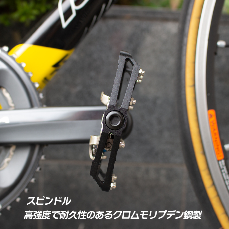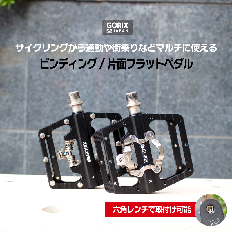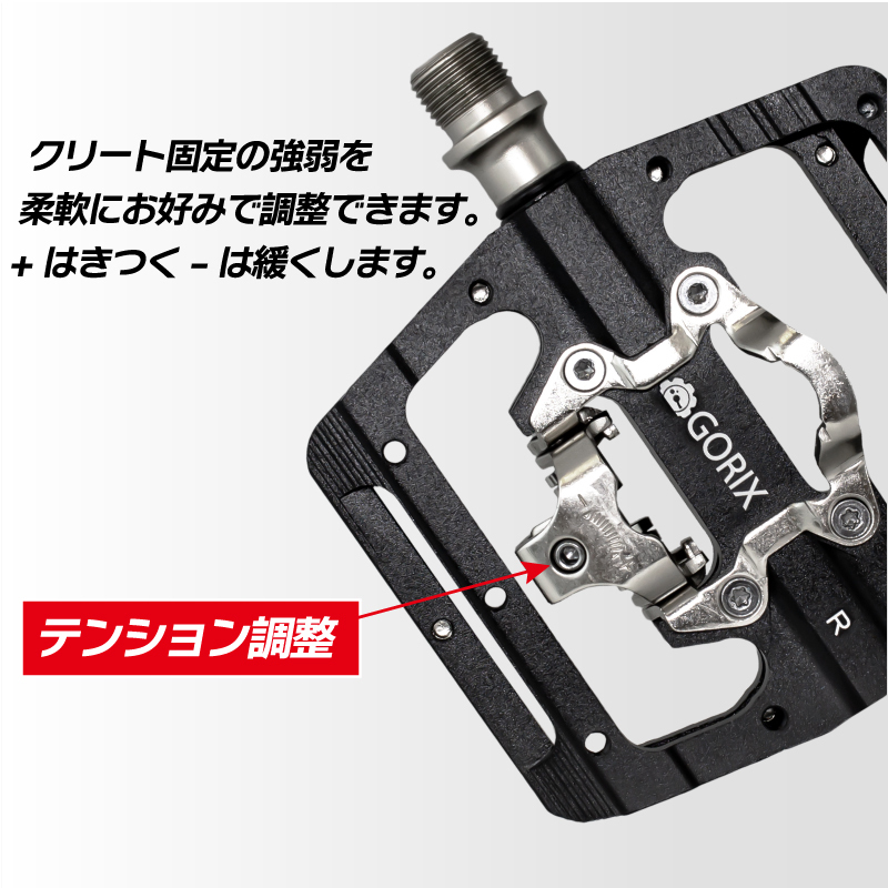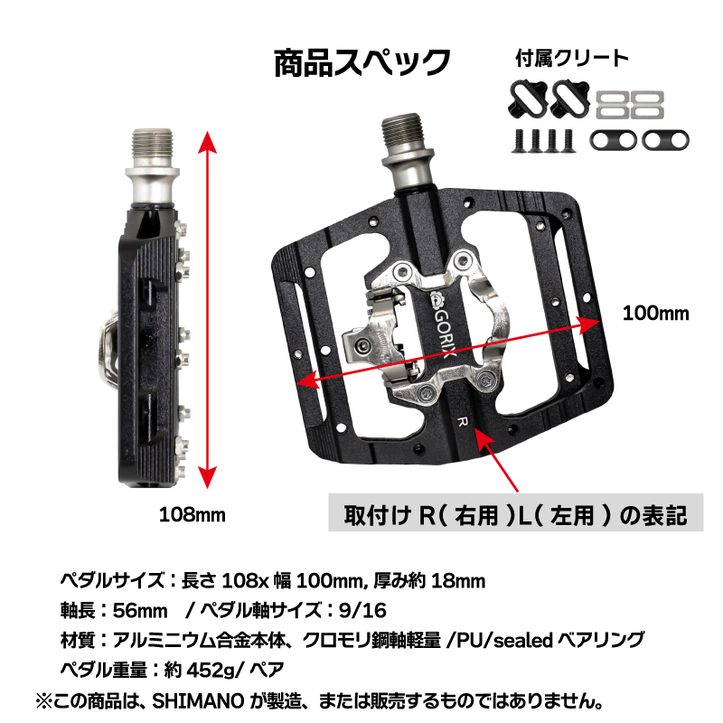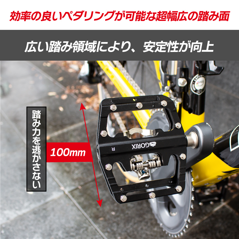 様々なタイプのシューズで使える両面ペダル。 サイクリングなどでのサイクルシューズ2穴クリートで使えるビンディンペダル。 通勤や街乗りなど普段のシューズで使えるフラットペダル。 ロードバイクやクロスバイク、マウンテンバイクなどの自転車に。 [ビンディング] シマノSPD対応なのでクリートをお持ちならそのままでOKです。 クリートは付属もしています。 テンション調整も可能でクリート着脱の強弱を調整できます。 [幅広タイプ] 踏み面が広くペダリングの安定性が向上。 踏む力を逃がしにくいので効率の良いペダリングが可能に。 [滑り止め] フラット面にはスパイクピンを配置していて 靴底をしっかりとホールドします。 [六角レンチで着脱] 六角レンチで取付けが可能です。 (おすすめ)ペダルの交換時にグリスを塗ると固着を防止するのでグリスは塗っておく事をおすすめします。 商品内容ペダル、クリート、クリート取付金具 ペダルタイプ両面(ビンディング・フラット) ペダルサイズ長さ108x幅100mm, 厚み約18mm 軸長56mm ペダル軸サイズ9/16 材質アルミニウム合金本体、クロモリ鋼軸軽量 / PU/sealedベアリング ペダル重量約452g/ペア カラーブラック | |