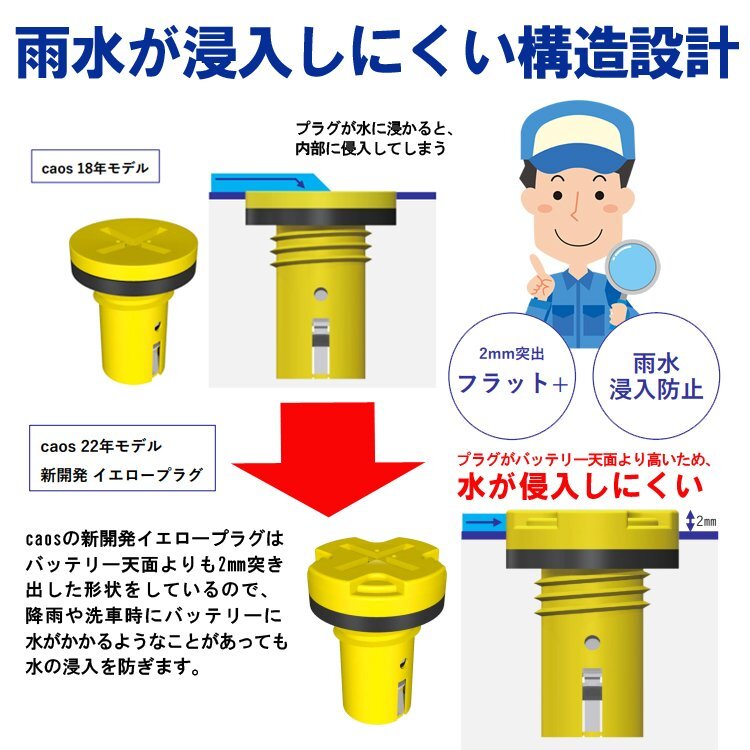 | 商品説明 | 【24時間365日メーカー保証対応安心サポート付き】 ※メーカー保証安心サポートの登録は、商品到着後14日以内に必ずお申込み下さい。 ※商品到着後14日以内に安心サポートの登録を行わない場合、安心サポート対象外となります。 ●新開発の液口栓「イエロープラグ」。caos 18年モデルで使用していたシートの機能をプラグ内に埋め込むコンセプトで、シートレスデザインでありながらも、減液抑制性能を維持。また傾いた時の液漏れ発生率を約70%(※当社独自の傾斜液漏れ試験にて液漏れが起こるまでの回数(A3シリーズ比較))に減少し、雨水がバッテリー内部に浸入しにくい液口栓構造で、走行時のトラブルを低減しました。 ※数値は効果を保証するものではありません。 ※発送まで数日かかる場合がございますので、納期に余裕を持ってご注文をお願い致します。 ■製品保証:3年 ■端子位置:R ■5時間率容量(Ah):46 ■普通充電電流(A):4.0 ■最大外形寸法(mm):総高227x箱高203x幅129x長さ238(※1) ■電池質量(約kg):12.5 ■取っ手:樹脂取っ手 ■ 液栓種類 :フラット+ ※2 ■JANコード:4549980649510 ※1 長さは取っ手取り付け部の凸部を除いた寸法になります。 ※2フラット液栓より約2mmの凸があります。取付けの際は、車両の搭載可否をご確認ください。 ◎要項表の値は、日本産業規格(JIS D 5301)に基づく試験結果であり、保証値ではありません。 |