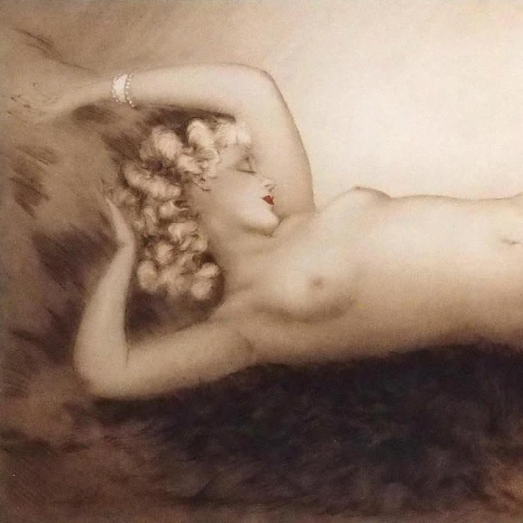 「睡眠」ルイ・イカールによる1934年作、直筆サイン入りのエッチング・アクアチントです。横長の大型作品で、「Louis Icart The Complete Etchings」No.438掲載作品です。