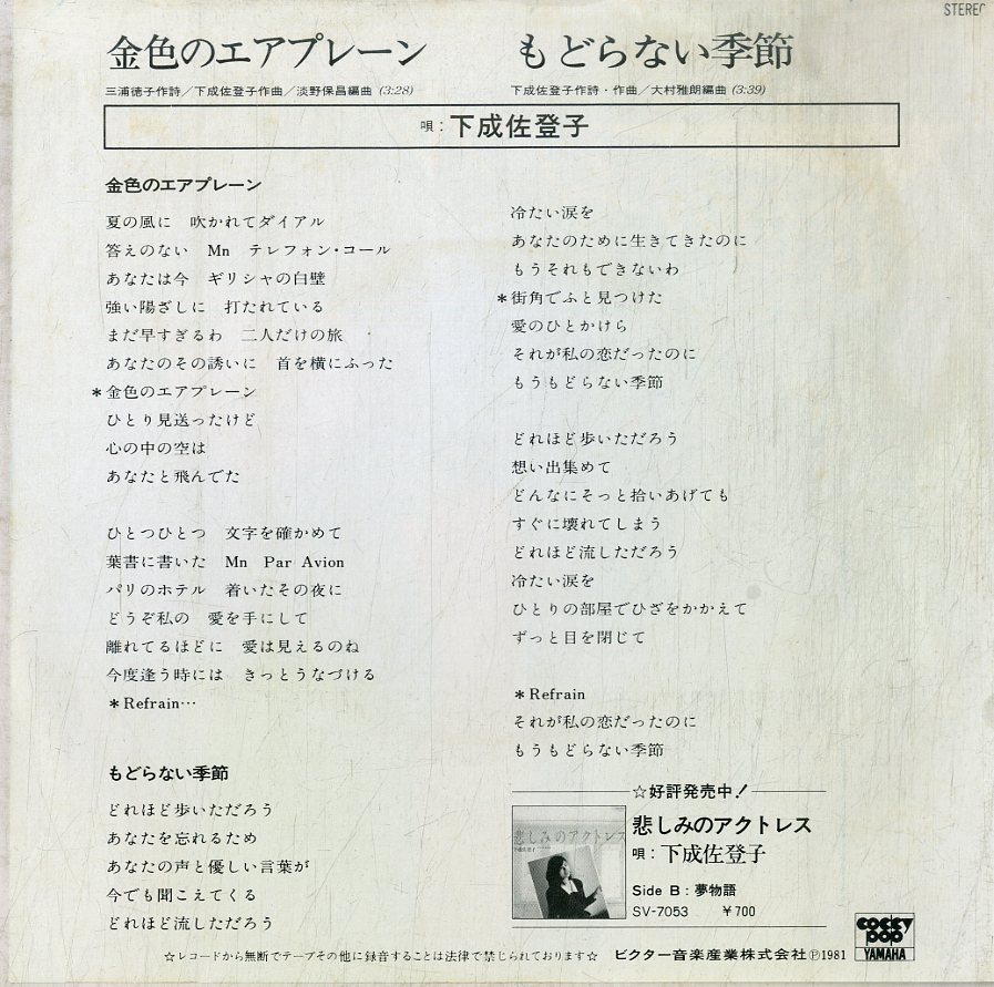 C00189168/EP/下成佐登子「金色のエアプレーン/もどらない季節(和モノ・ライトメロウ)1981年:SV-7107」