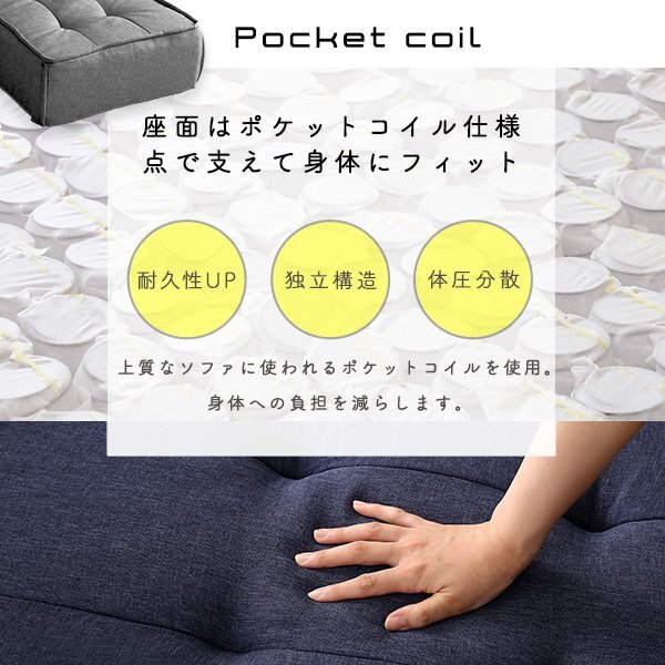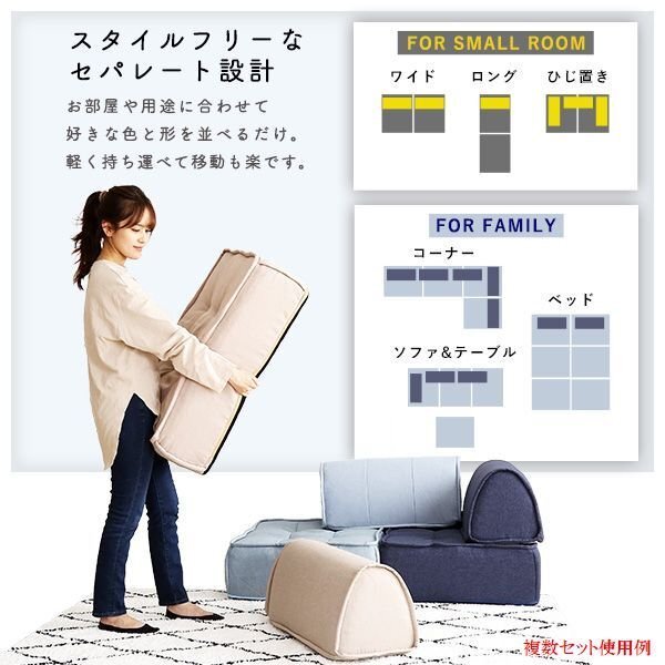 | 【ポイント】 イロとカタチを楽しむ一人掛けフロアクッションセットです。 フロアクッションは複数並べておくとロングソファとしてもお使い頂けます。 お部屋の用途に合わせて好きな色と形を並べるだけ! 軽量設計なので、気軽に持ち運べて楽ちんです。 座面はポケットコイルを使用しており、耐久性 独立構造 体圧分散があるので、身体への負担を軽減します。 バッククッションは中身はかための高密度ウレタンフォームを使用しており、 へたりにくいので身体をしっかり支えてくれます。 裏面には滑り止めがついているため、寄りかかっても滑らなくなっております。 |