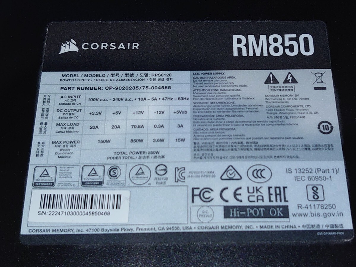 【CORSAIR 850W ATXプラグイン電源 RM850】