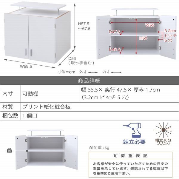 | 【カラー】 ダークブラウン、ホワイト 【サイズ】 <外寸> 幅59.5×奥行53×高さ57.5~67.5cm <内寸> 扉内:幅55×奥行48.5×高さ50cm 可動棚:幅55.5×奥行47.5×厚み1.7cm(3.2cmピッチ5穴) 【材質】 本体:プリント紙化粧合板 【耐荷重】 可動棚:(約)15kg以下 【生産国】 ベトナム 【梱包】 サイズ:66×57×15.5cm、重量:14kg 【その他】 可動棚:1枚 【組み立て品】 お客様による組み立てが必要です。 【ご注意】 ・サイズ、重量は概算です。 ・商品カラーはご使用のモニターによって実際の明るさや色と異なって見える場合がございます。 |
