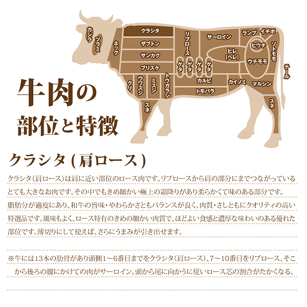 | クラシタは肩ロースとも呼ばれますが、リブロースから肩の部分にまでつながっているとても大きなお肉です。その中でもきめ細かい極上の霜降りがあり柔らかくて味のある部分です。和牛ならではの深いコクと旨味を持ち、肉質・さしともにクオリティの高い特選品です。用途は[しゃぶしゃぶ][すきやき鍋][焼き肉]に最適です。季節を問わずいつでもお楽しみいただけるお肉です。 |