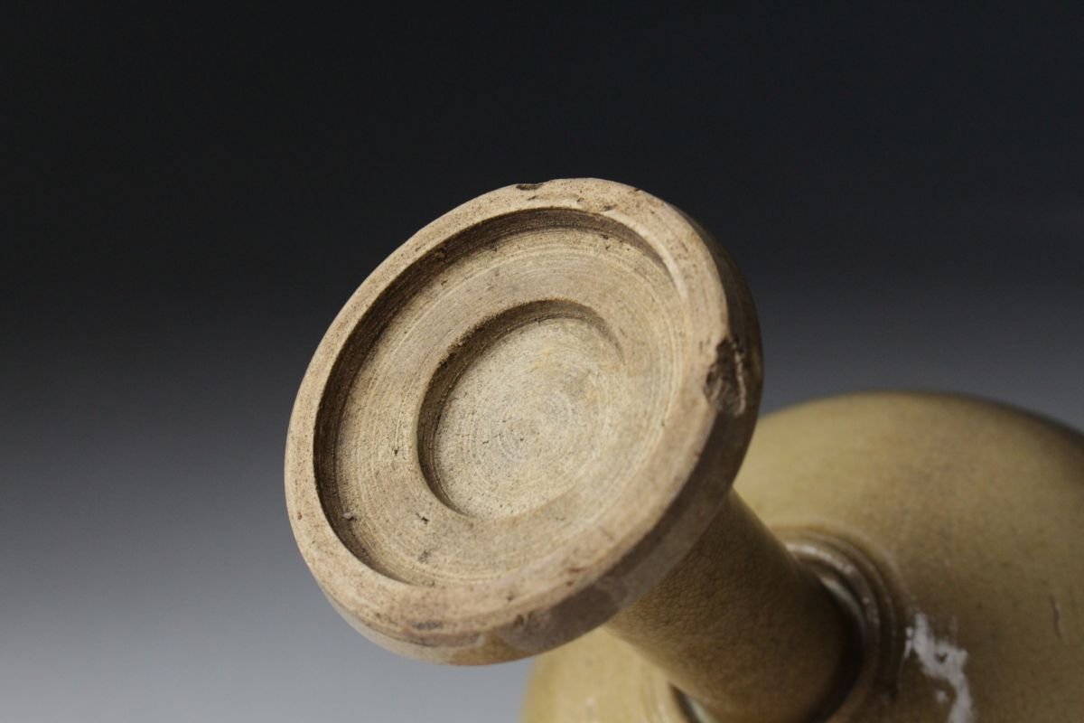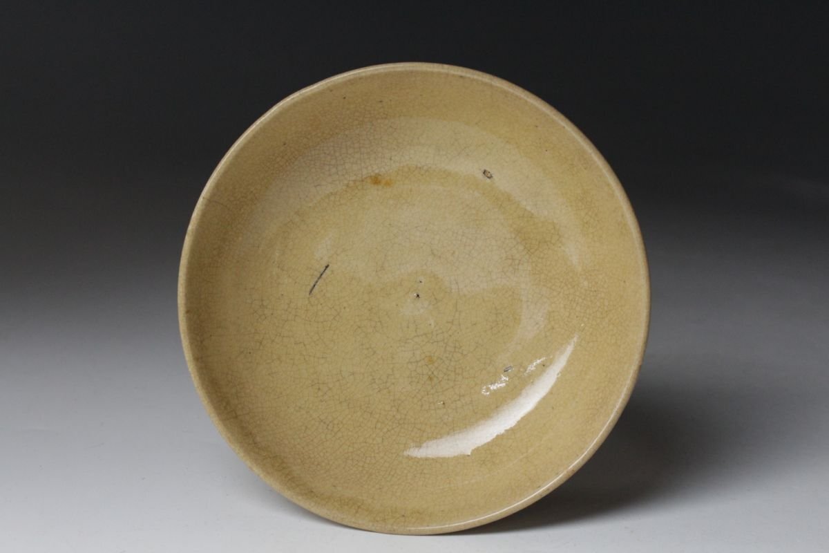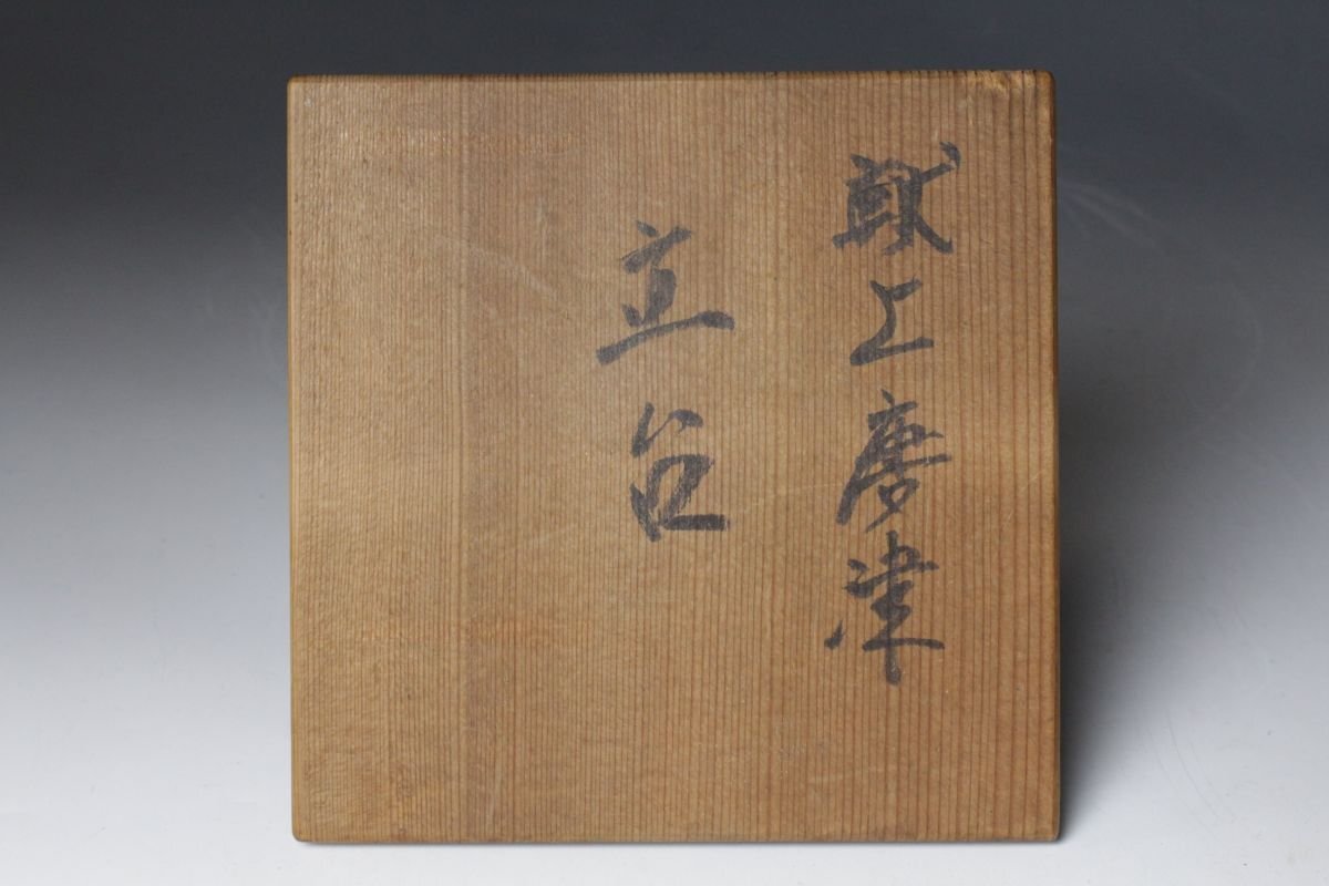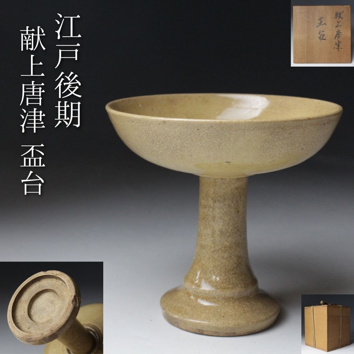 [.QQ]25.08 25082945 T* * * 商品詳細 * * * ここでしか出逢うことのできない唯一の美をご紹介させて頂きます。 江戸後期 献上唐津 盃台 細やかな貫入が全体に広がり、時代の息吹を感じさせる盃台。 黄色みを帯びた釉は、江戸後期の献上唐津ならではの穏やかで上品な風合いを湛え、 器そのものが静かに歴史を語ります。 手に取れば、貫入のひとつひとつに光が反射し、 酒を注げば器の温もりと共にその趣が一層深まります。 茶席や酒席にそっと置けば、古唐津ならではの雅やかさが場に満ち、 時を超えた美意識を感じさせる逸品です。 この機会に是非ご堪能下さい。 ■商品内容/ 盃、箱 ■サイズ/横12㎝×高11.5㎝ 箱:四方16.5㎝×高19㎝ ■状態/経年による スレ、小傷、汚れ、窯被、底に欠け 箱にスレ、傷、汚れ、蓋に僅かな曲がりがございます。 ※写真にてご確認、ご了承の上ご入札下さい。