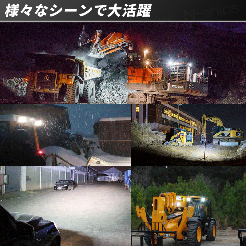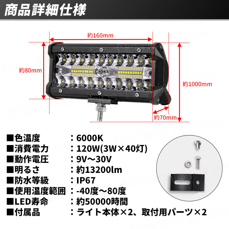| 超高輝度3030LEDチップを40灯搭載しており、 10000lm以上の直視できないほどの明るさを実現! IP67の防水・防塵性能を備えているので 様々な用途で利用可能です。 素材はアルミ合金で、耐久性が高く、 また、扇型のデザインで効果的な放熱が可能なので 長時間の利用にも向いています。 取付はプラスとマイナスの2本の配線を 電源に直接つないでボルトで固定するだけの簡単利用! 設置用ボルト等も付属しているので 商品到着後、そのまま簡単取り付け可能! ■様々なシーンで大活躍■ ●車やトラックに取り付けて夜間作業での補助灯やバックランプに ●建設機械(フォークリフト、クレーン車、ダンプ、ユンボなど)に 取り付けて作業灯やサーチライトとして ●キャンプやアウトドア等、屋外でのイベントやパーティで 利用すれば非常に明るい照明として ●店舗や看板のライトアップ用として ●船舶に取り付ければ夜間作業用や夜釣りの投光器や集魚灯として ●工事現場や建設現場で設置して簡単な作業灯や荷台灯として ●災害時の簡易照明、常夜灯として ■商品仕様■ 色温度:6000K 消費電力:120W(3W×40灯) 電圧:9V~30V 明るさ:約13200lm 防水等級:IP67 使用温度範囲:-40度~80度 LEDバルブ寿命:約50000時間 重さ:約230g(1個) サイズ:約165mm×約80mm×約60mm 付属品:ワークライト本体×2、取付用パーツ×2 ※ロットや製造時期により一部デザインが変更となる場合がございます。 | |||