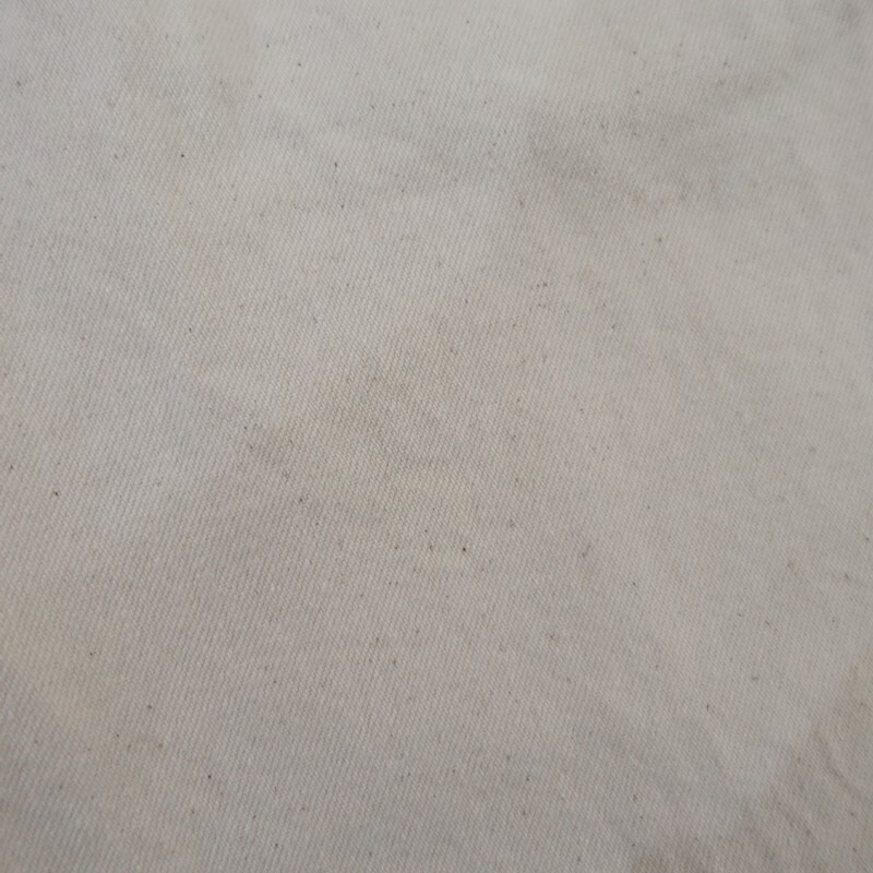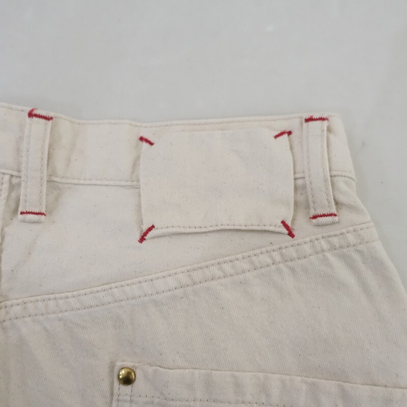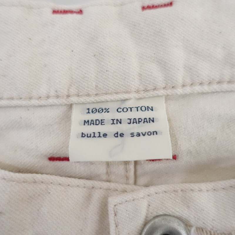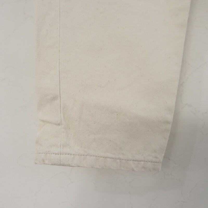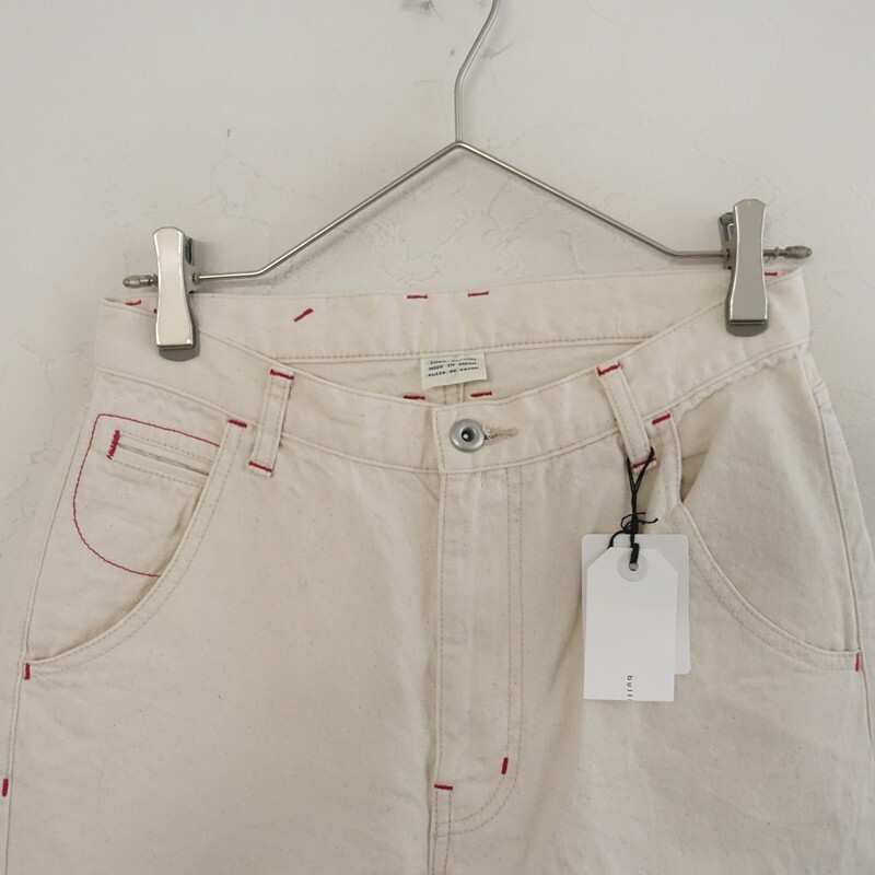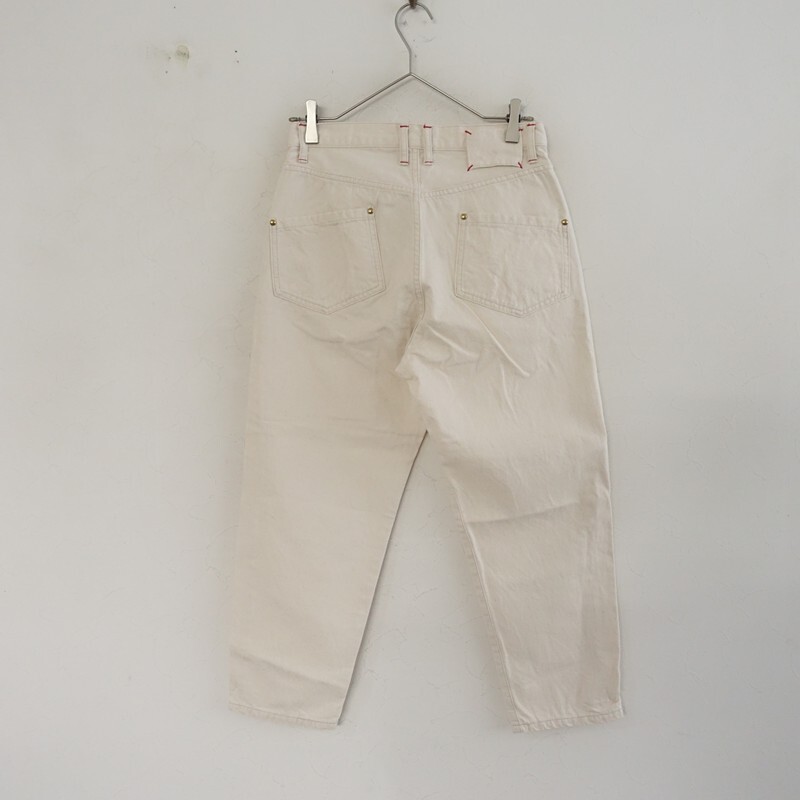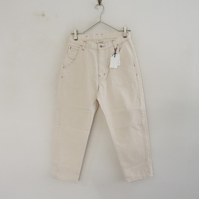 | bulle de savonのコットンデニムパンツです。カラーは綿カス混じりのエクリュです。若干薄手のコットンツイル生地を使用。ほぼ透け感はなく、ナチュラルな風合いの素材です。前立てはジップフライ、5ポケット仕様、バックに共布パッチを配したテーパードパンツです。赤い糸のステッチがアクセントです。定価(メーカー希望小売価格)12,980円の商品です。 |