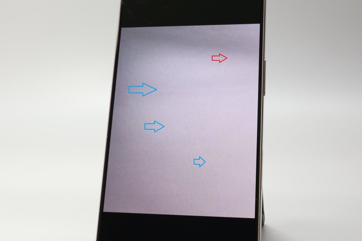 ・インカメラ撮影時、写真ともに縦(赤矢印)と横(青矢印)に光のラインが写り込みます(写真6 ※インカメラで撮影した写真を撮影してます)